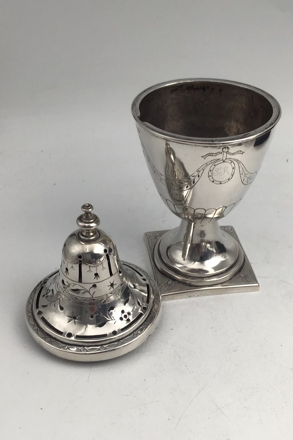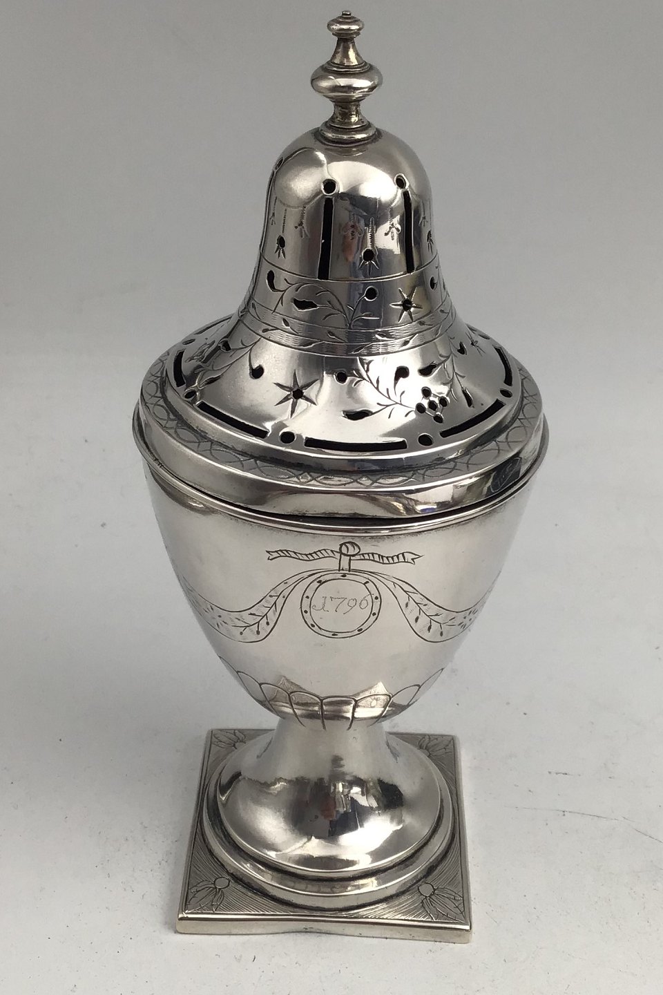 Frederik Janus Borchard Albrecht Creutzberg (1754-1826) Sølv StrødåseMåler H 17 cm (6.70 inch) Diam 7.3 cm (2.87 inch) Vægt 192.5 gr (6.79 oz) (Graveret 1796)