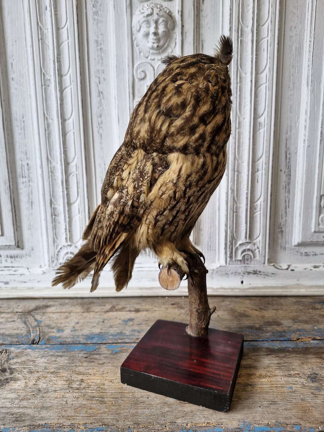 Udstoppet skov hornugle i flot stand monteret på natur grenHøjde 39 cm.