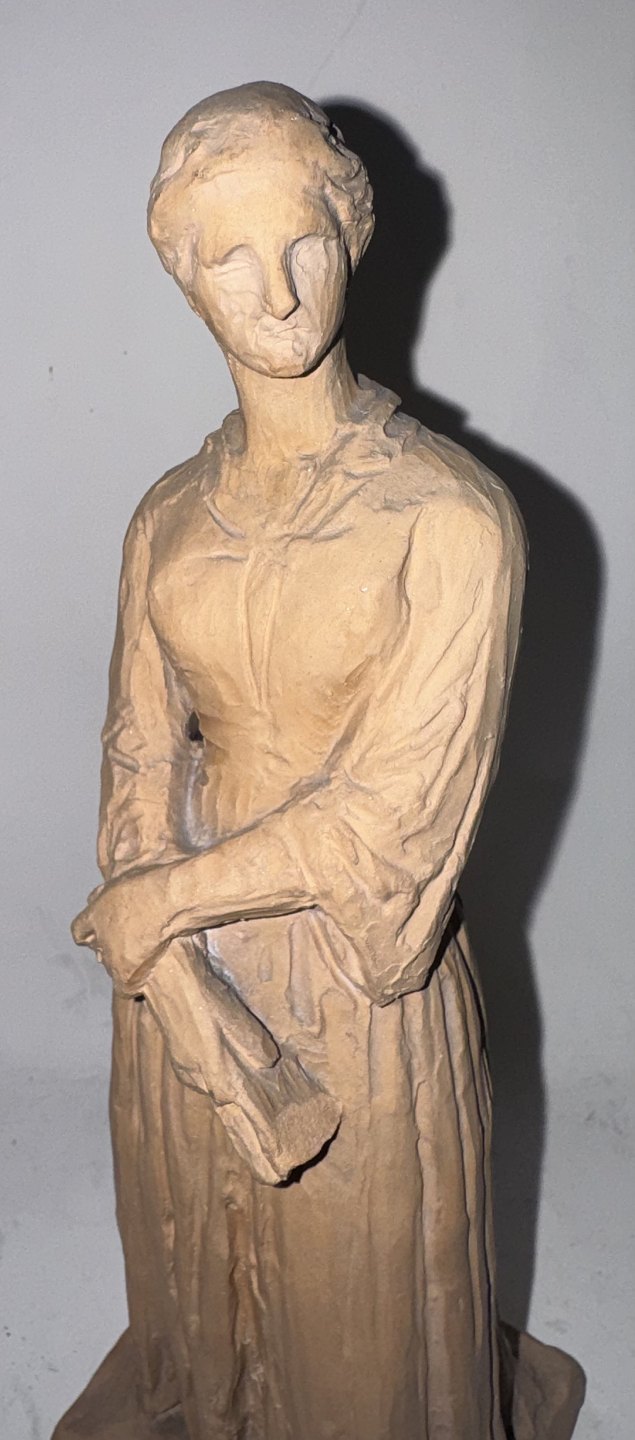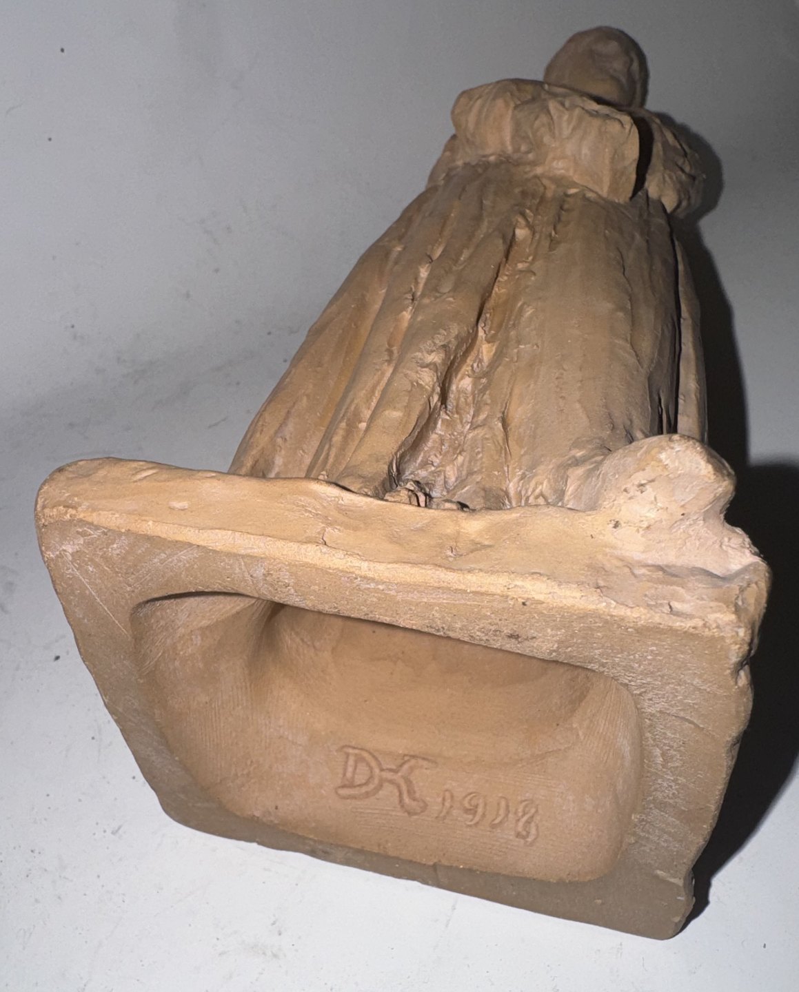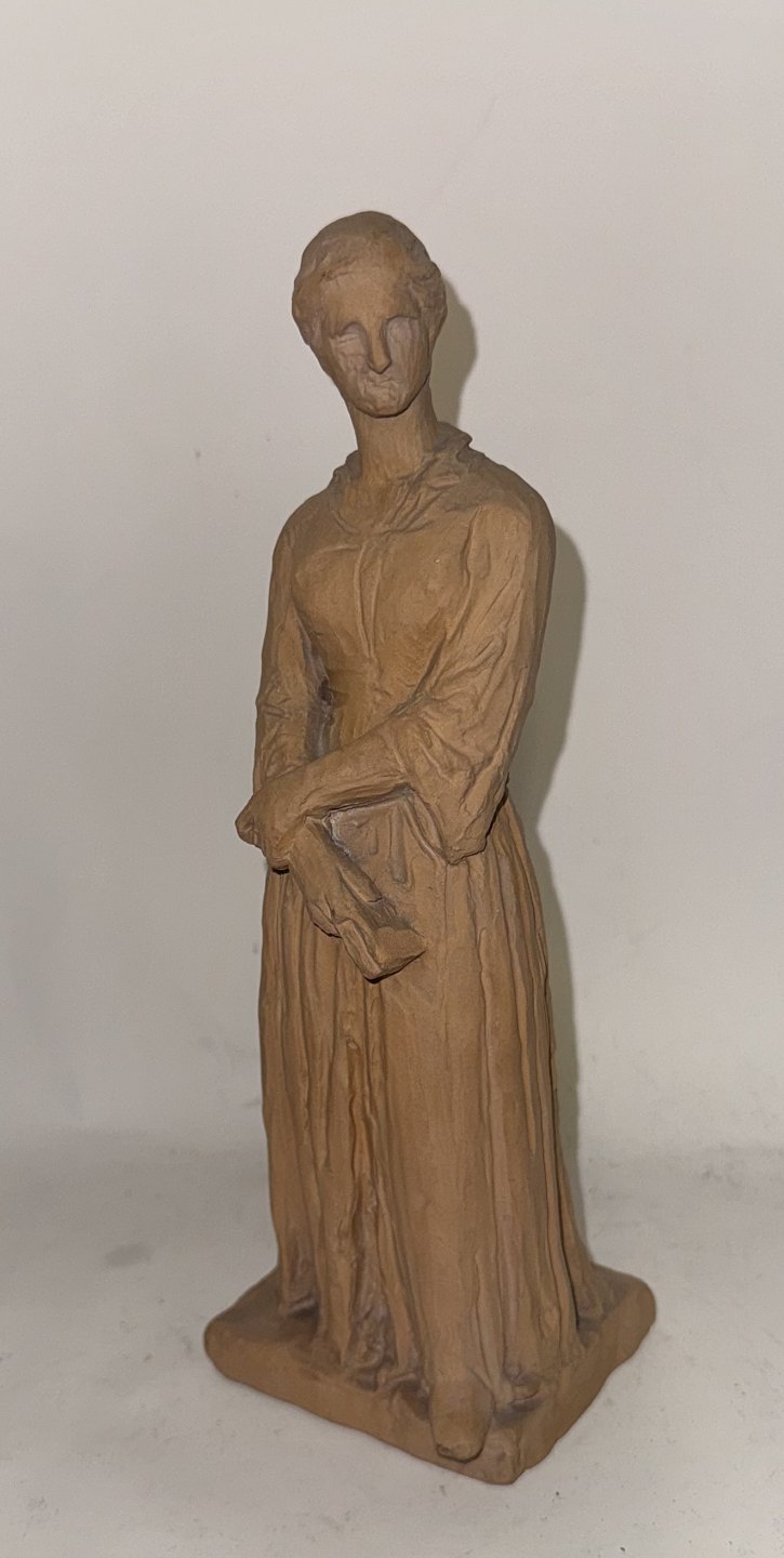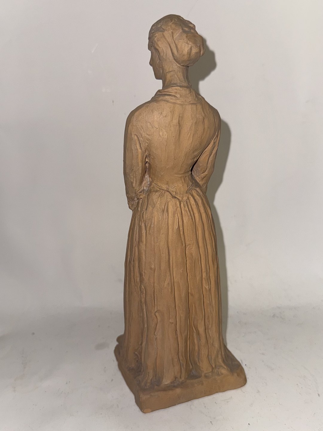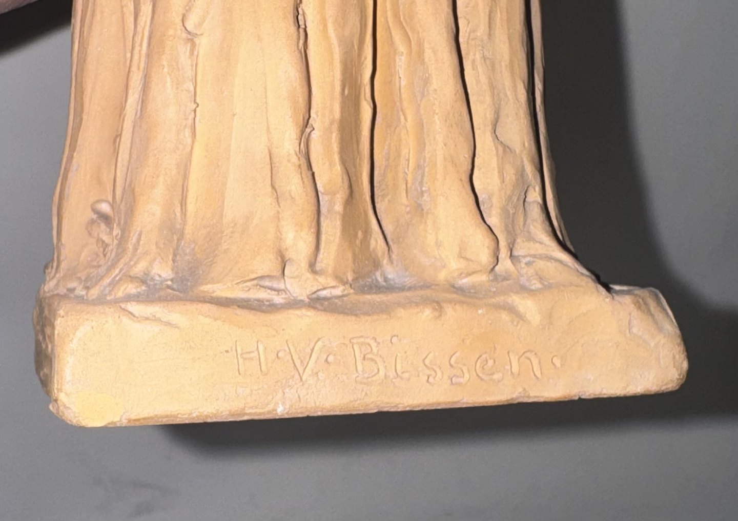 H. V. Bissen (1798-1868): Figur af stående kvinde. Udført i lertøj. Kunstnerens navn indridset på soklens bagside. Fremstår i god stand uden skader eller reparationer. Signeret med monogram samt 1918 indvendige ? Højde: 22,5 cm.v/ Jesper Reutemann