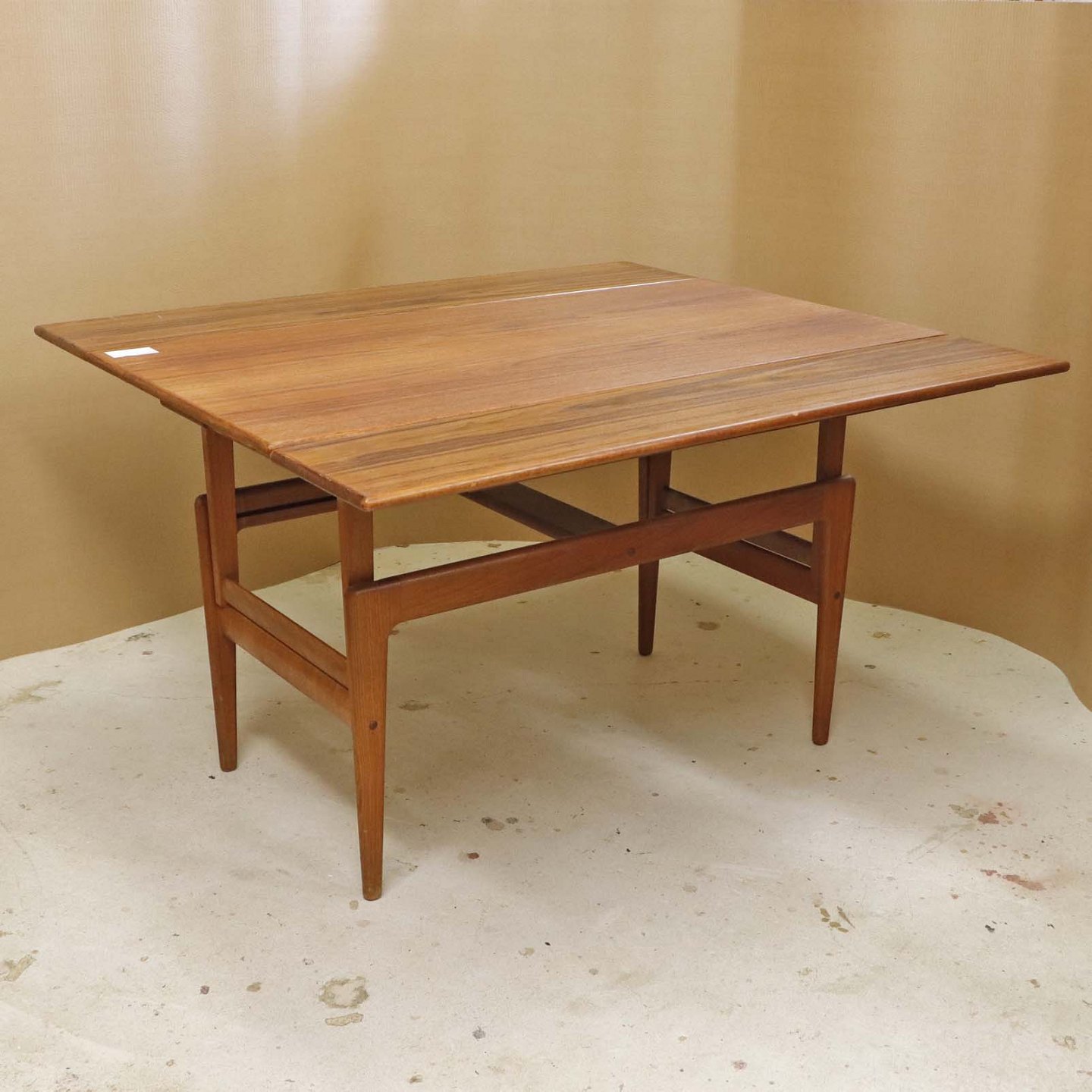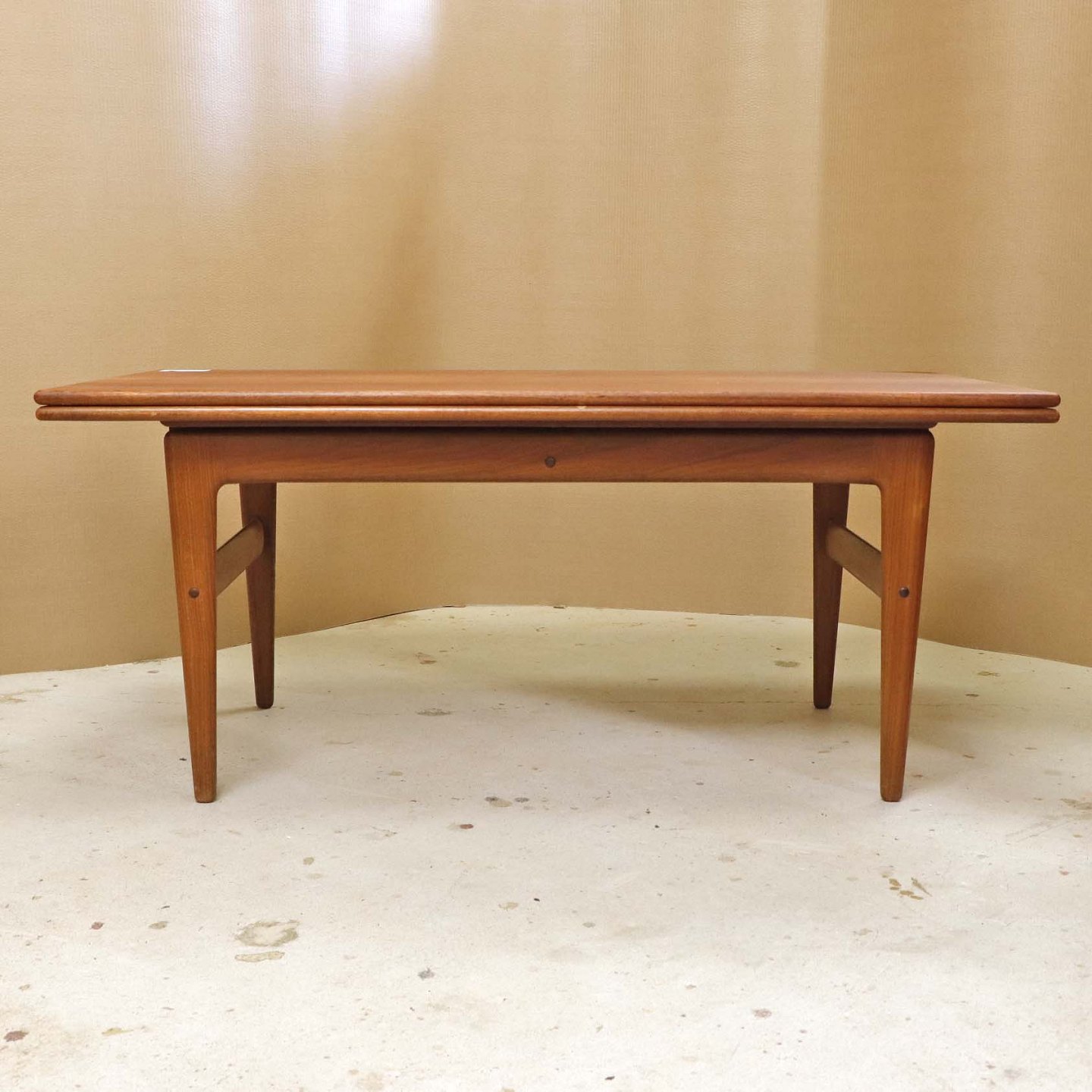 Sofa- og spisebord i samme møbel. Bordet er fremstillet i teaktræ og har to underliggende udtræksplader, som befinder sig på hver af bordets lang-sider.Dansk producent