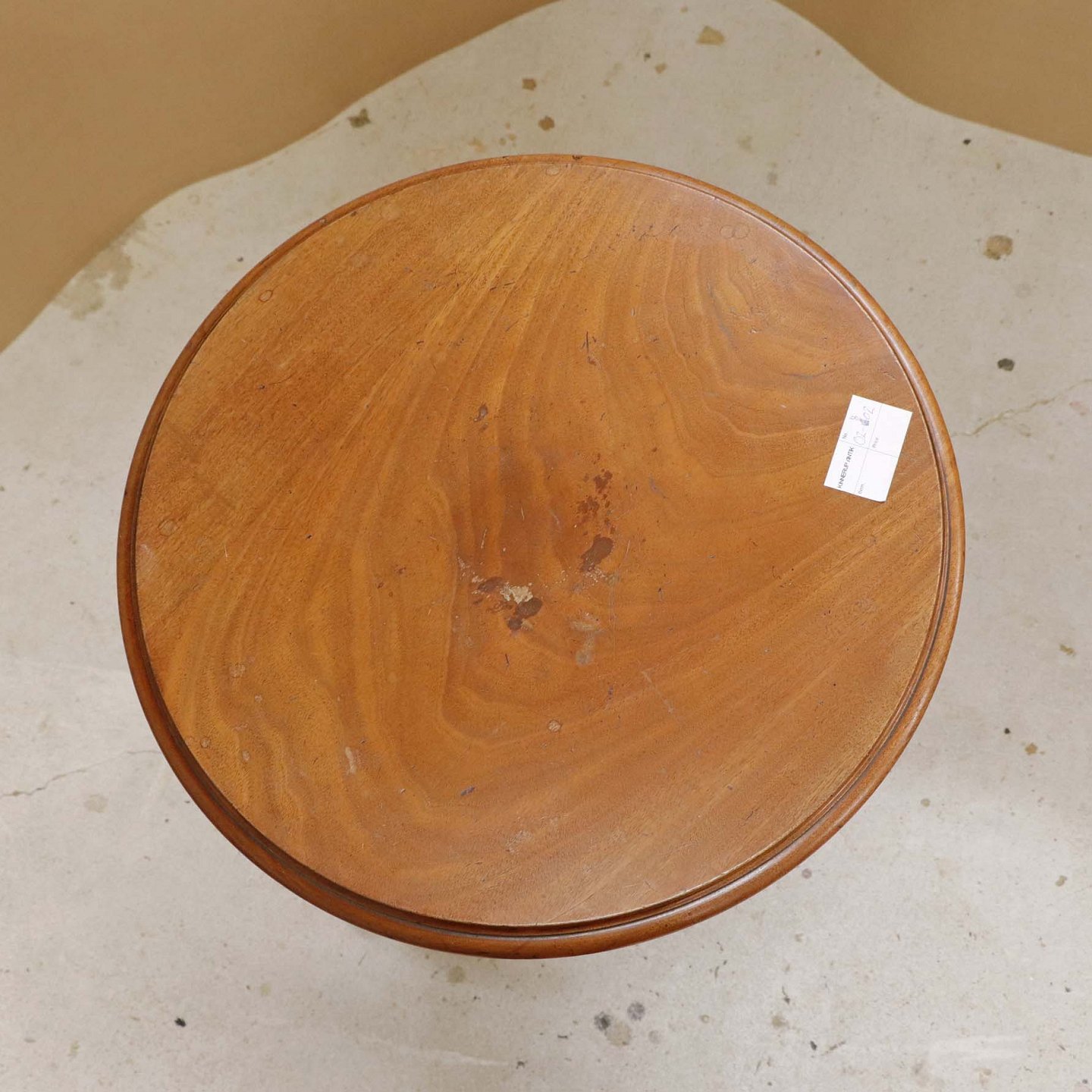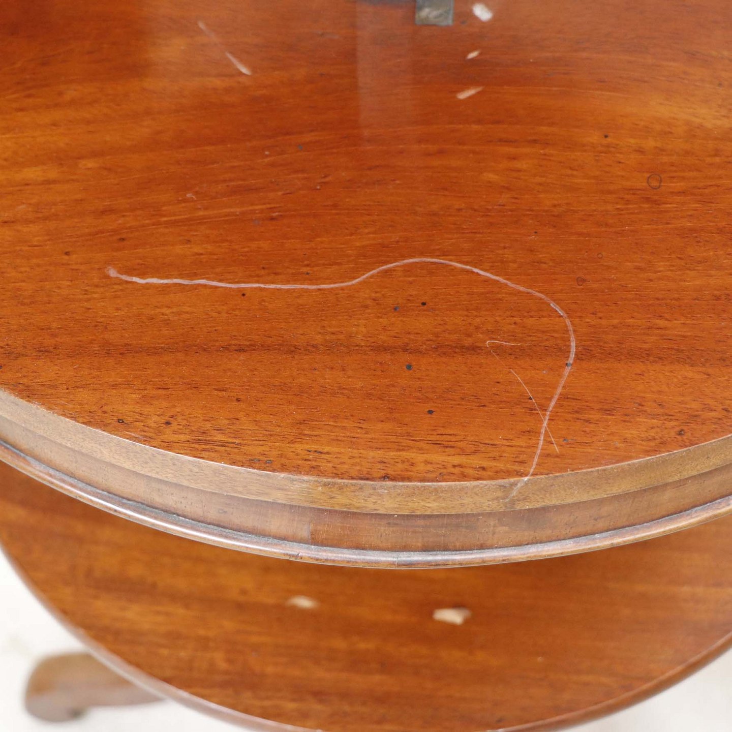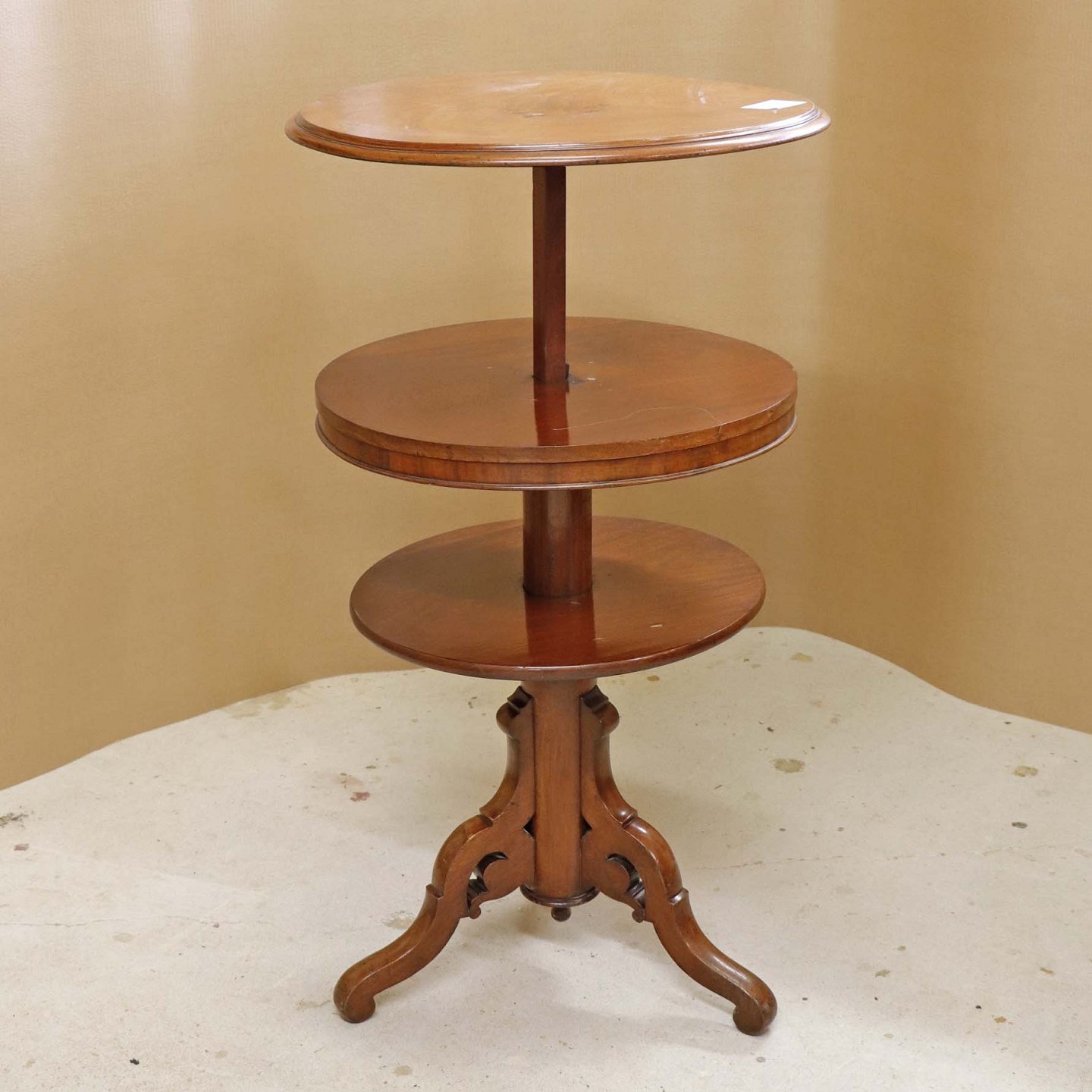 Et ældre serveringsbord på tre fødder i lakeret maghoni med tre etager. Opsatsdelen kan slås sammen til et bord.Bordtypen kaldet en Dumbwaiter blev oprindeligt lavet i England i midten af det 18. århundrede, og brugt til opbevaring af mad-og drikkevarer i spisestuer.