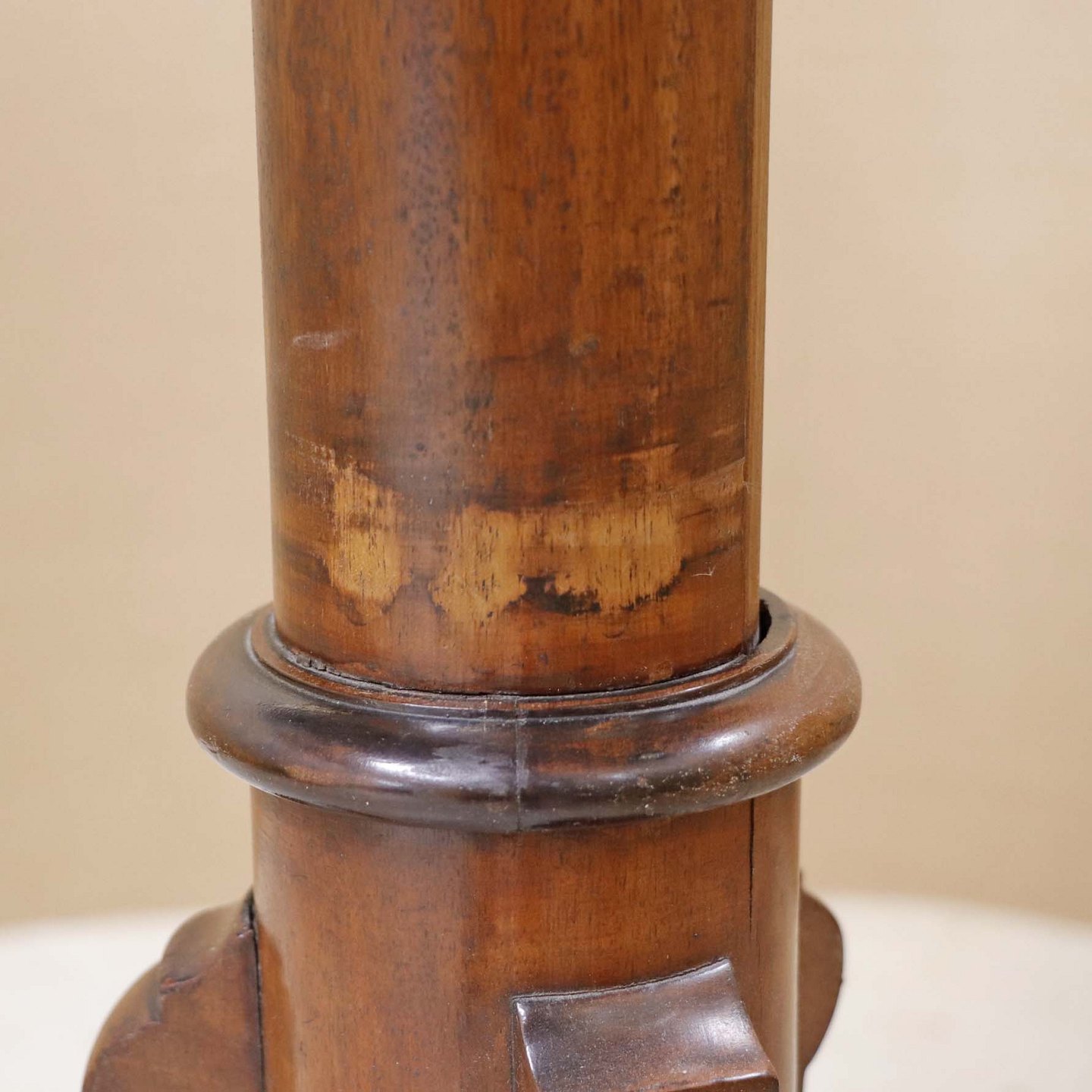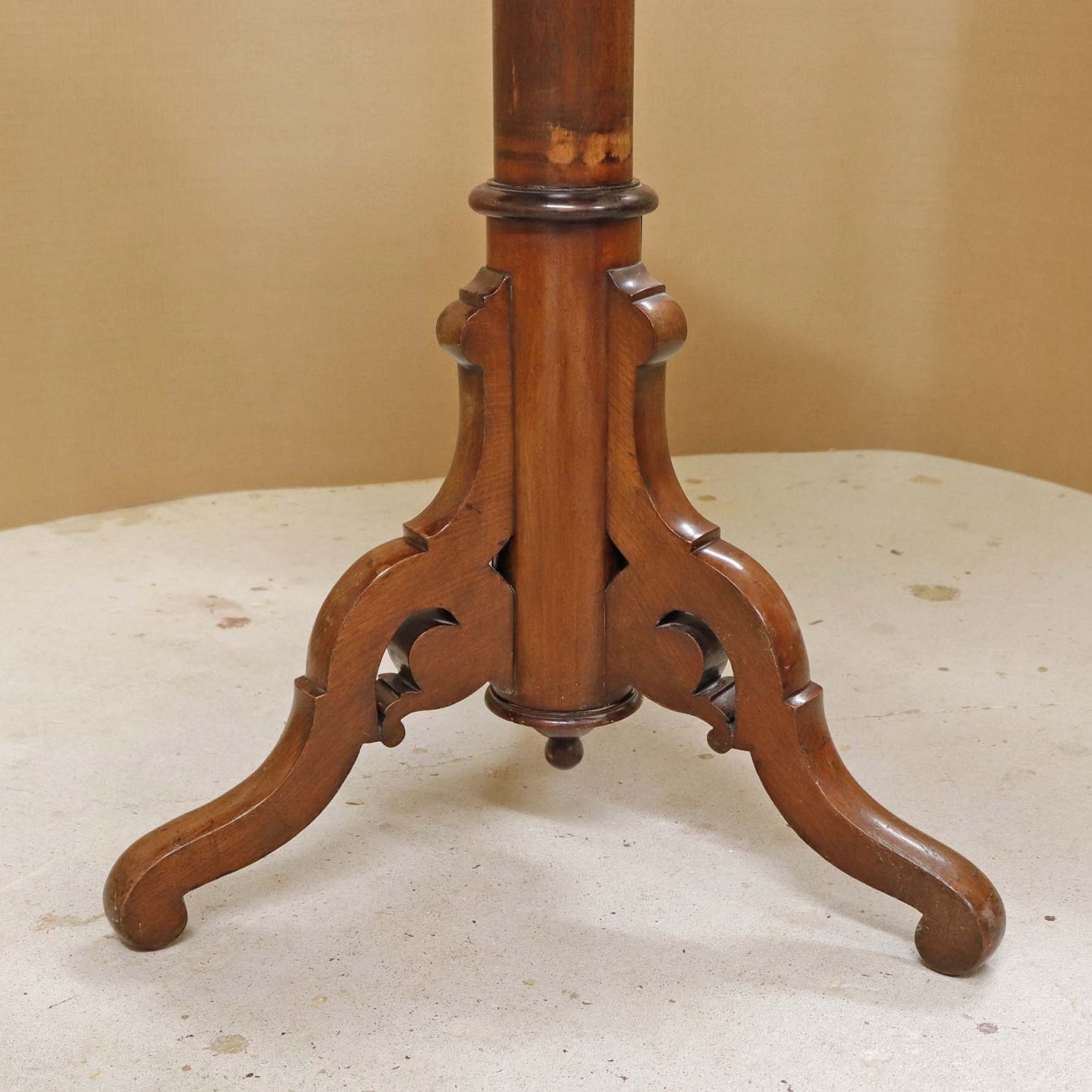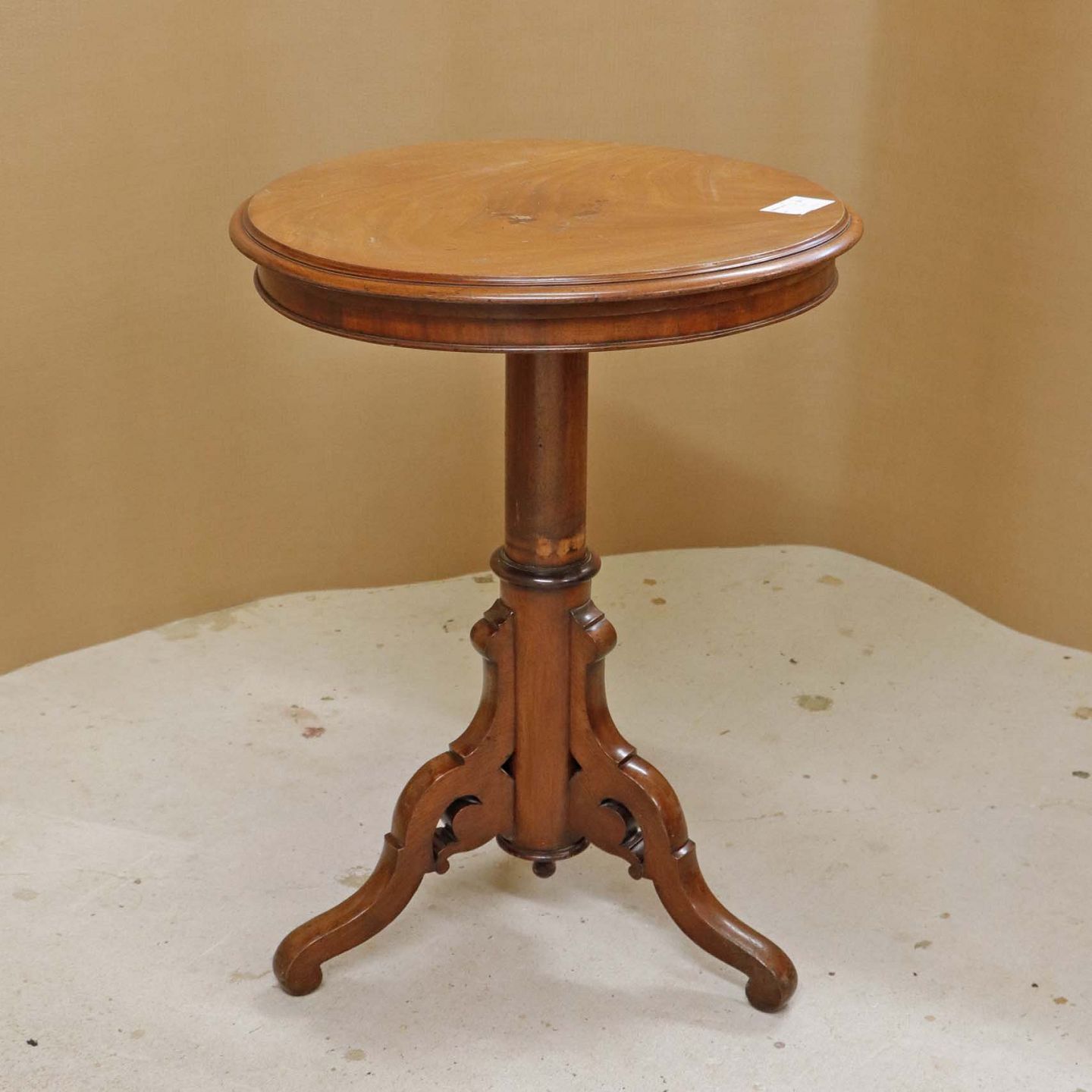 Et ældre serveringsbord på tre fødder i lakeret maghoni med tre etager. Opsatsdelen kan slås sammen til et bord.Bordtypen kaldet en Dumbwaiter blev oprindeligt lavet i England i midten af det 18. århundrede, og brugt til opbevaring af mad-og drikkevarer i spisestuer.
