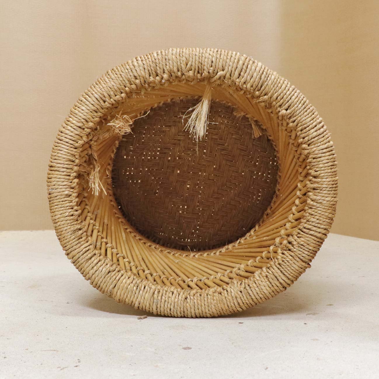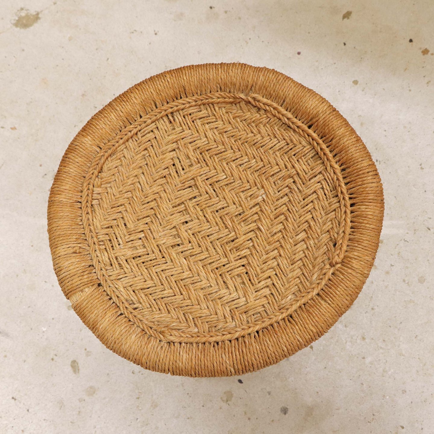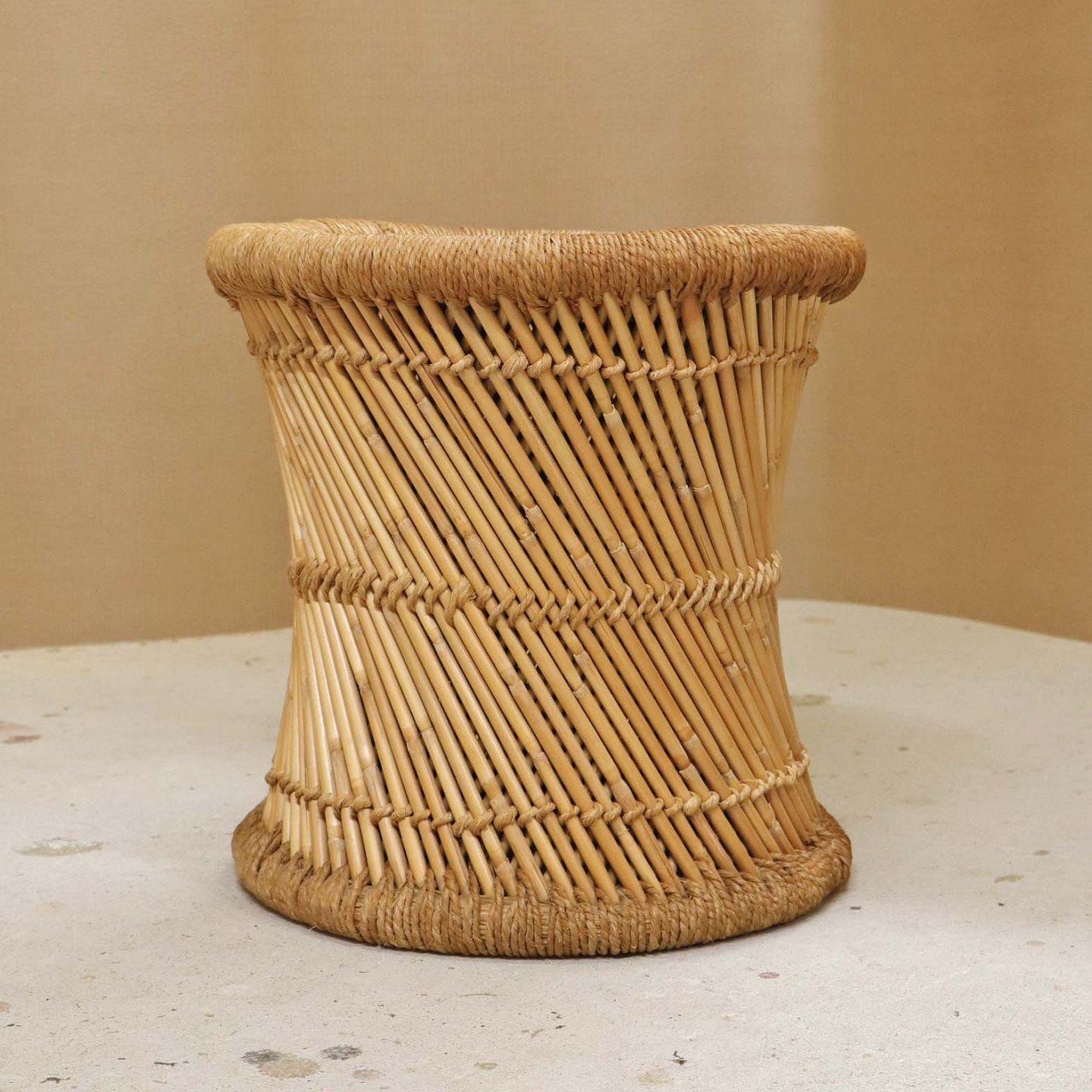 Mindre rund skammel med stel i bambus og sæde i flettet rattan.Producent ukendt