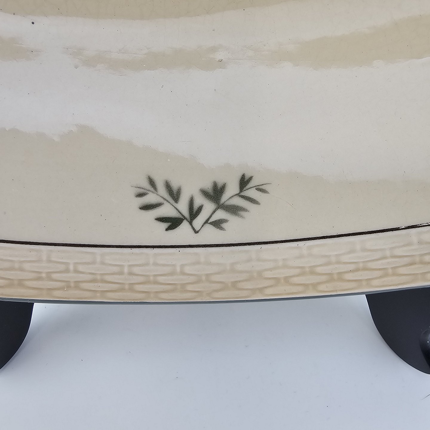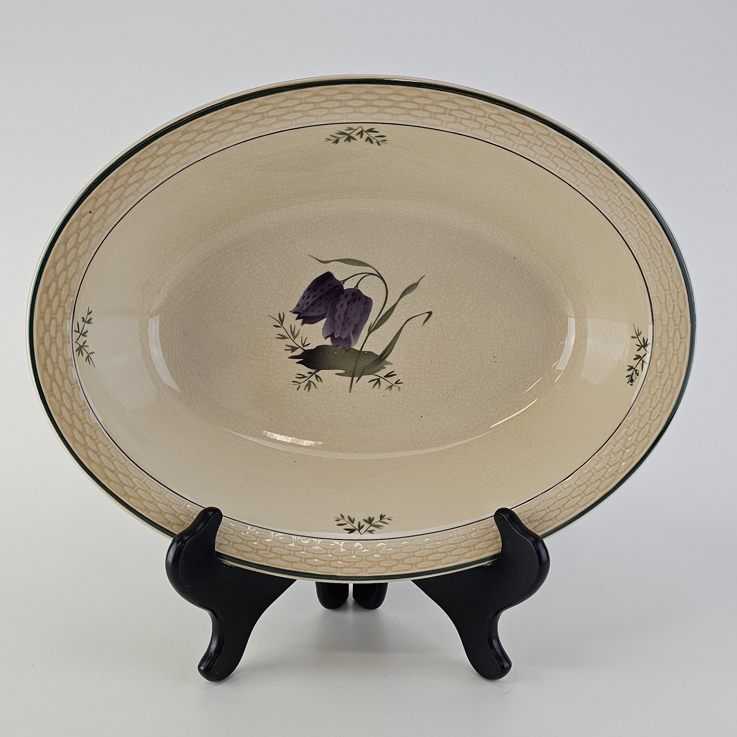 Fajancestel i stelform Viktoria II (Fletværk) med flettet kant og dekoration af en vibeæg blomst i violet og grøn, fremstillet i perioden 1934-1967