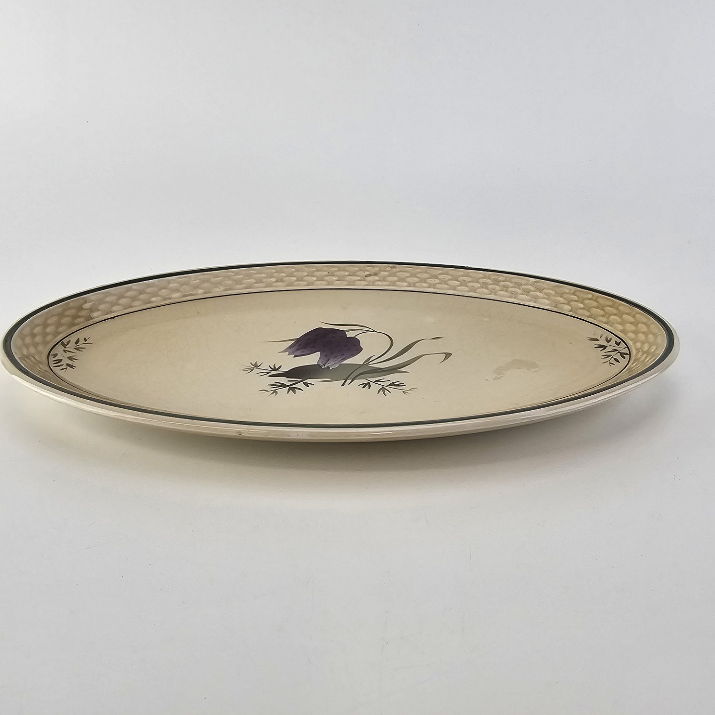 Fajancestel i stelform Viktoria II (Fletværk) med flettet kant og dekoration af en vibeæg blomst i violet og grøn, fremstillet i perioden 1934-1967