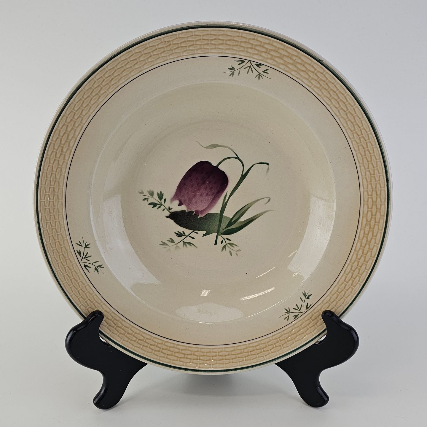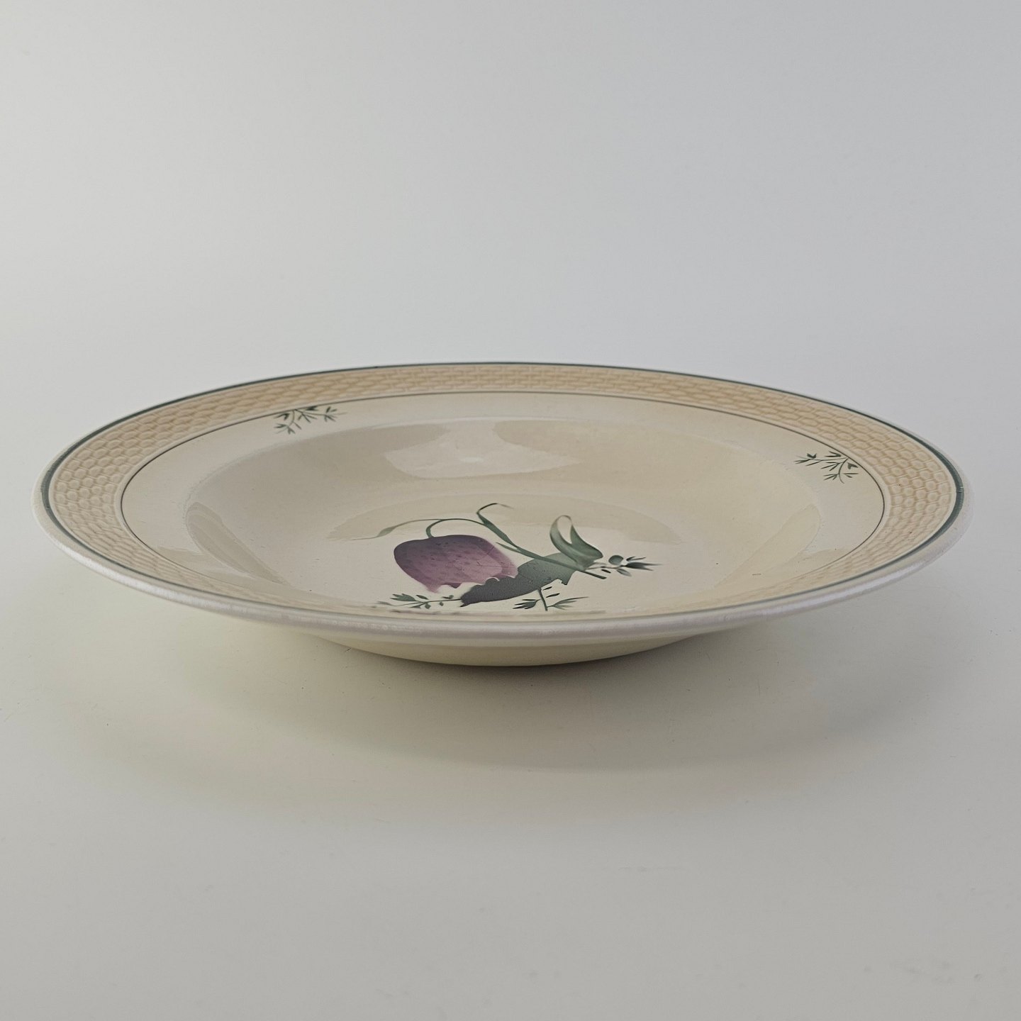 Fajancestel i stelform Viktoria II (Fletværk) med flettet kant og dekoration af en vibeæg blomst i violet og grøn, fremstillet i perioden 1934-1967
