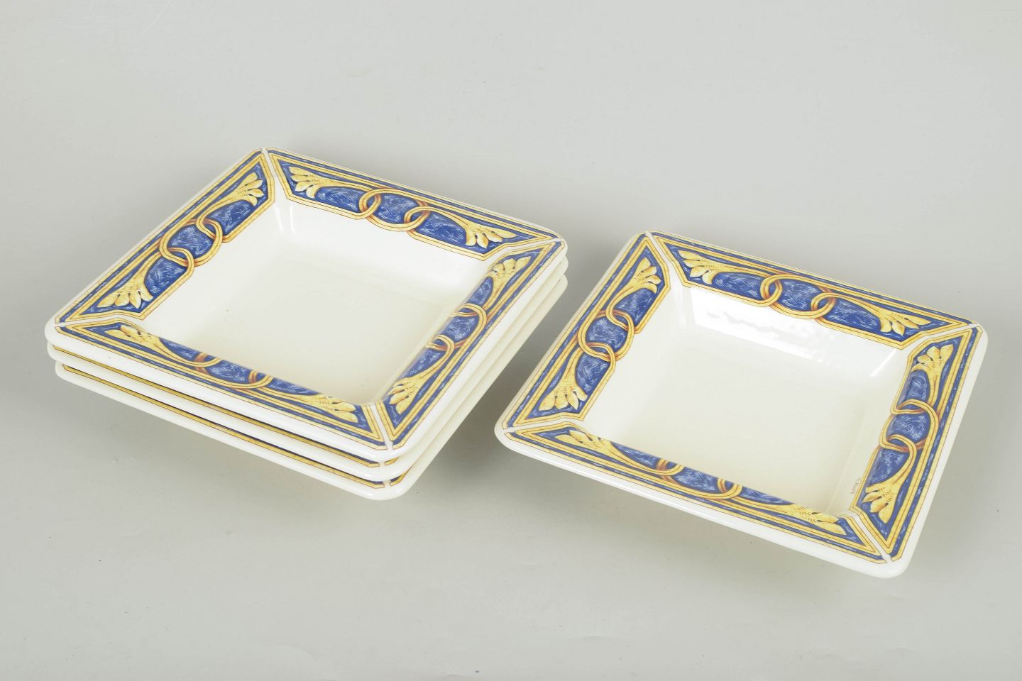 Tiffany Boutique, sæt af fire middagstallerkner.Dekorativt sæt i keramik bestående af fire middagstallerkner med bred kant dekoreret i blå, gule og gyldne toner med ornamentale mønstre.