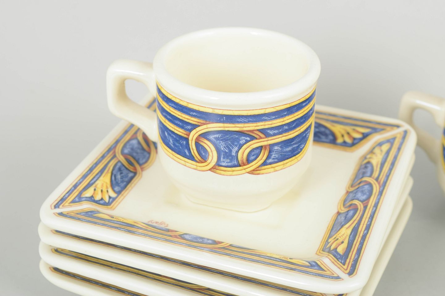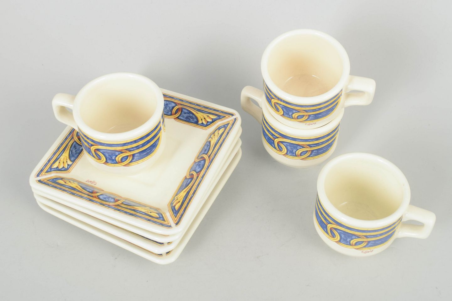 Tiffany Boutique, sæt af fire espressokopper med underkopper.Dekorativt sæt i keramik bestående af fire espressokopper med tilhørende underkopper, dekoreret i blå, gule og gyldne toner med ornamentale mønstre.