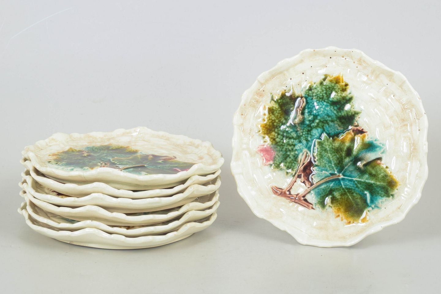 Gustavsberg majolika sæt af syv tallerkener.Dekorative tallerkener i glaseret fajance med reliefpræget og naturalistisk blomsterdekoration i farverig majolika glasur. Stemplet.
