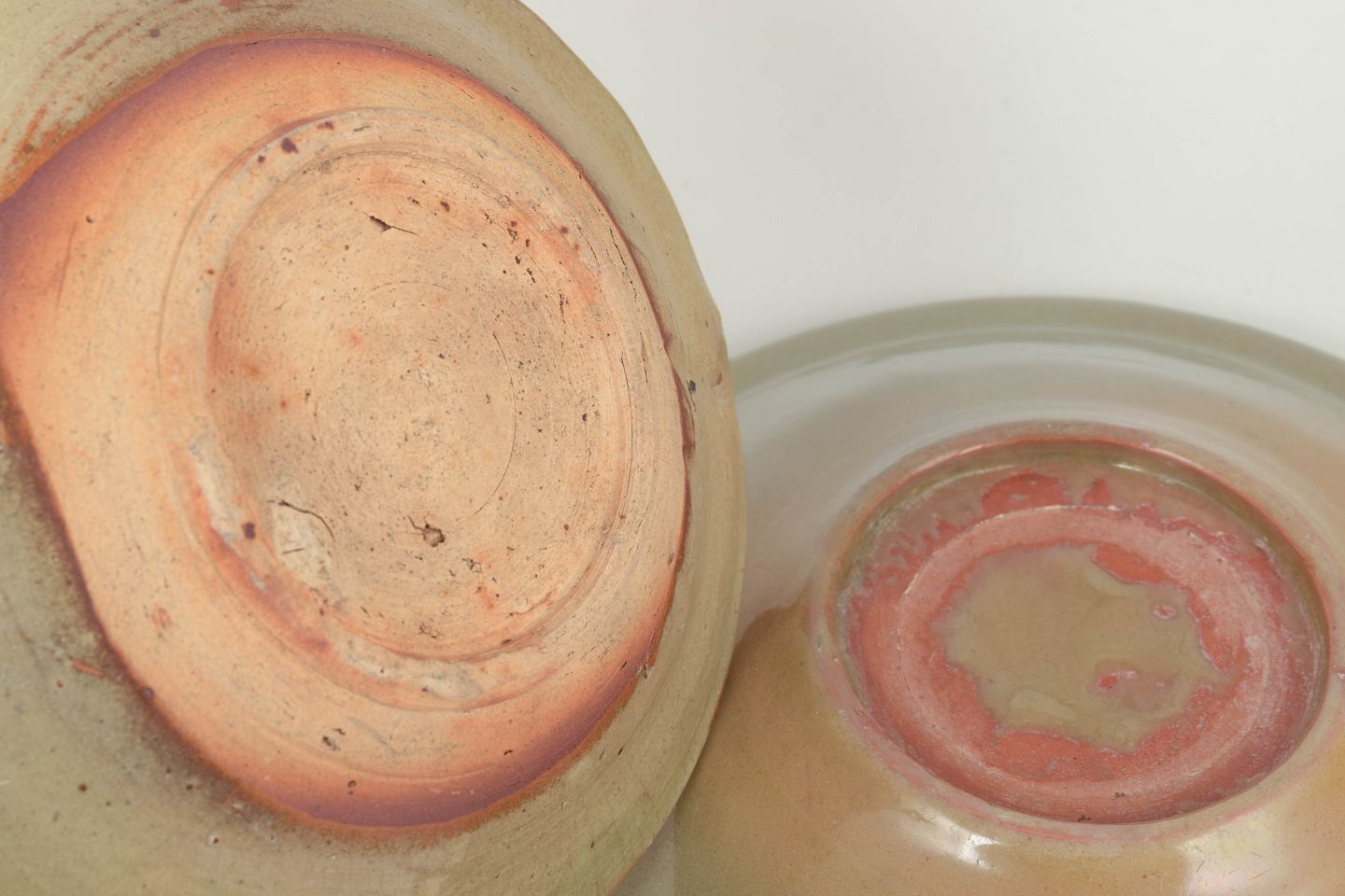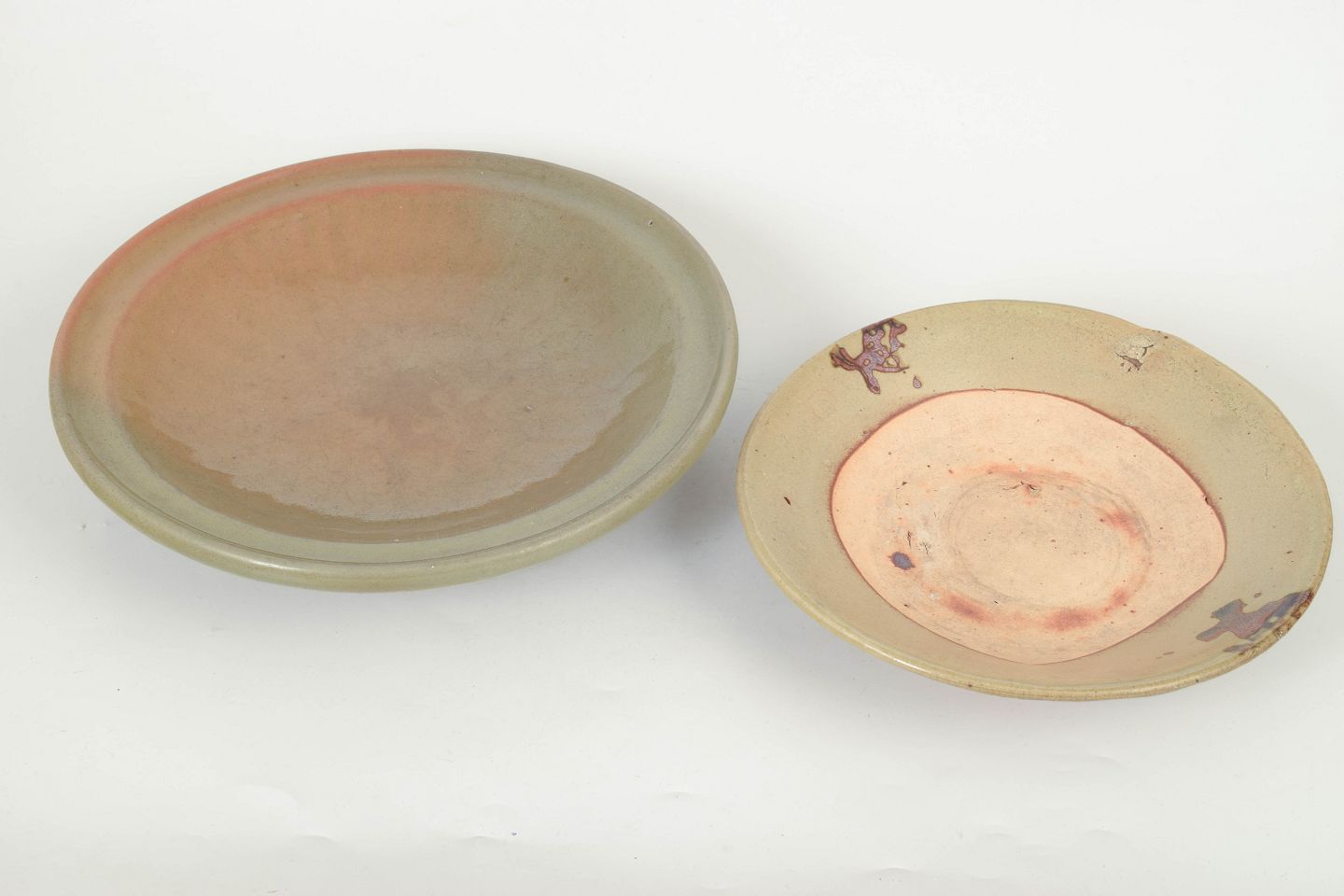 To fade, Qing-dynastiet (1644–1912)To keramiske fade, heraf et større med celadonglasur fra Longquan, med blød grønlig glasur og klassisk enkel form fra perioden.