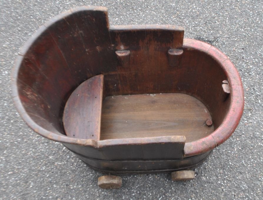 Barne badekar, 19. årh. Stavlimet bemalet træ. Med tøndebånd. På 4 hjul. H: 51 cm. L: 61 cm. B: 39 cm.Emne nummer: 29186