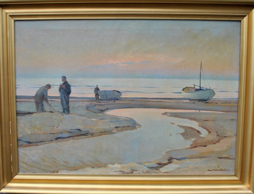 Valentinussen, Chr. (1903 - 1985) Danmark: Fiskere ved Vesterhavet. Olie på lærred. Signeret. H: 69 cm. B: 100 cm.Indrammet: H: 85 cm. B: 114 cm.