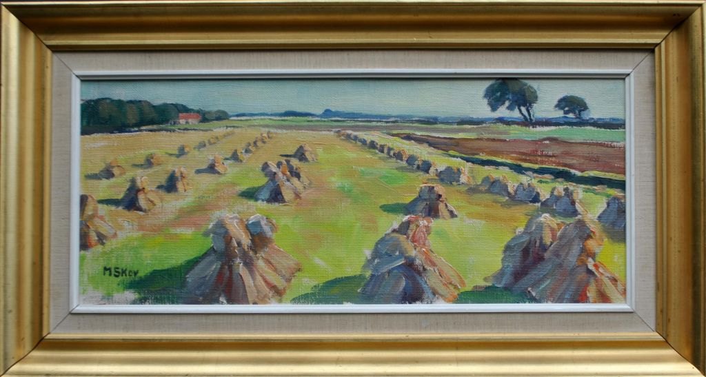 Skov, Marius (1885 - 1964) Danmark: Høstakke. Olie på lærred. Signeret. H: 30 cm. B: 71 cm.Indrammet: H: 49 cm. B: 90 cm.