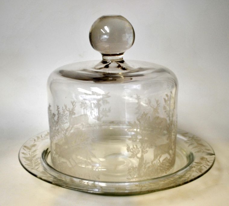 Osteklokke med hjortemotiv og tilhørende fad, ca. 1910. Holmegård, Danmark. Korpus dekoreret med hjorte mellem træer. Fad æstset med blomster. H.: 16 cm. Fad dia.: 21 cm.Klokke i perfekt stand. Fad med lille afslag.