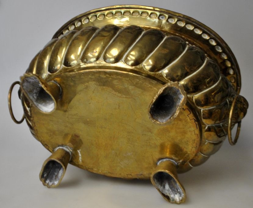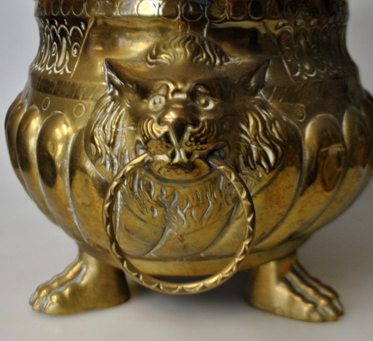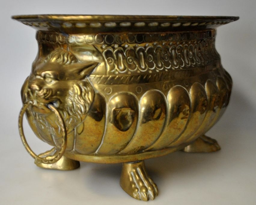 Dansk urtepotteskjuler i messing, 19. årh. Med løvefødder. Dekoreret med to løvehoveder med ringe i mund. H.: 17 cm. Dia.: 31 cm.Emne nummer: 29217