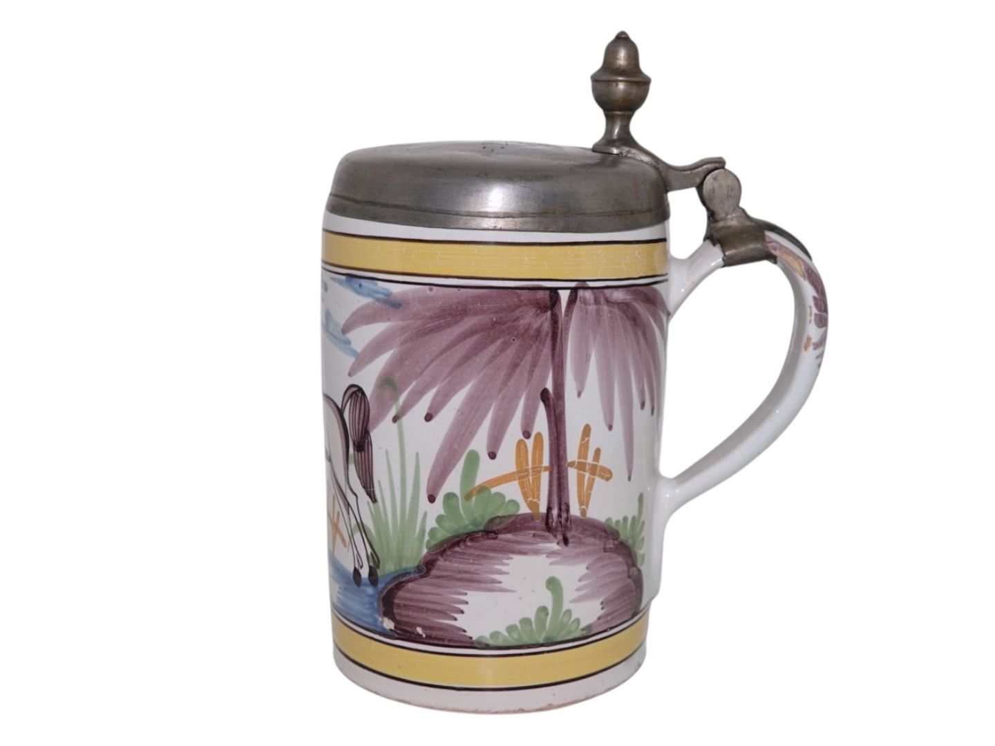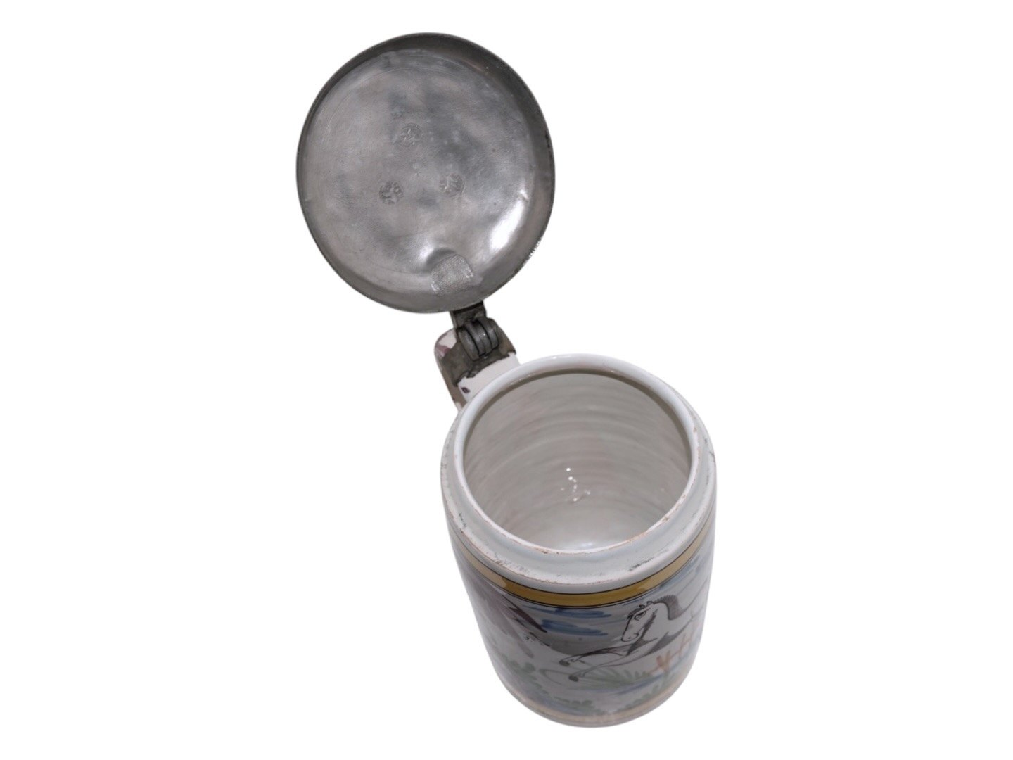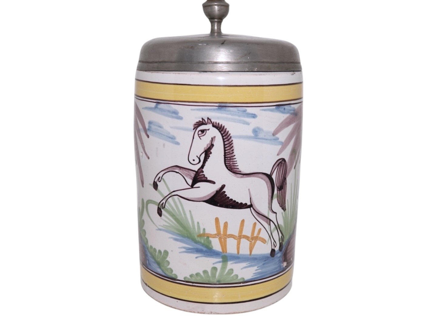 Kellinghusen / Bahlmann, Lubbert Diedrich.Stort fajance krus dekoreret med en hest. Der er et tinlåg der har senere inskription fra 1833. Kruset er fremstillet mellem 1790 og 1810.