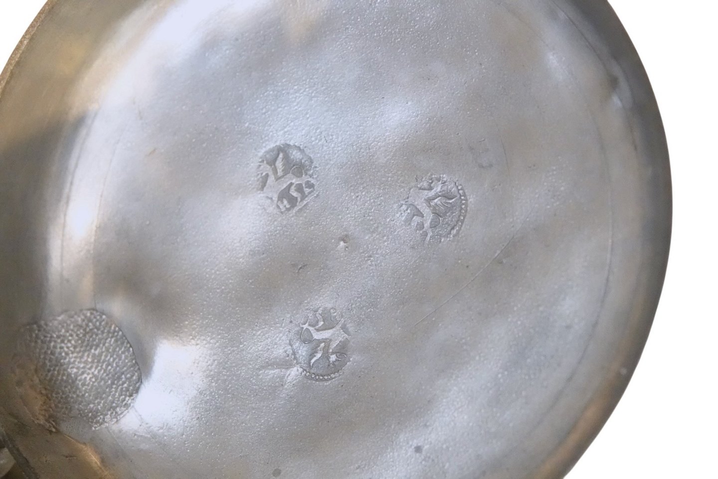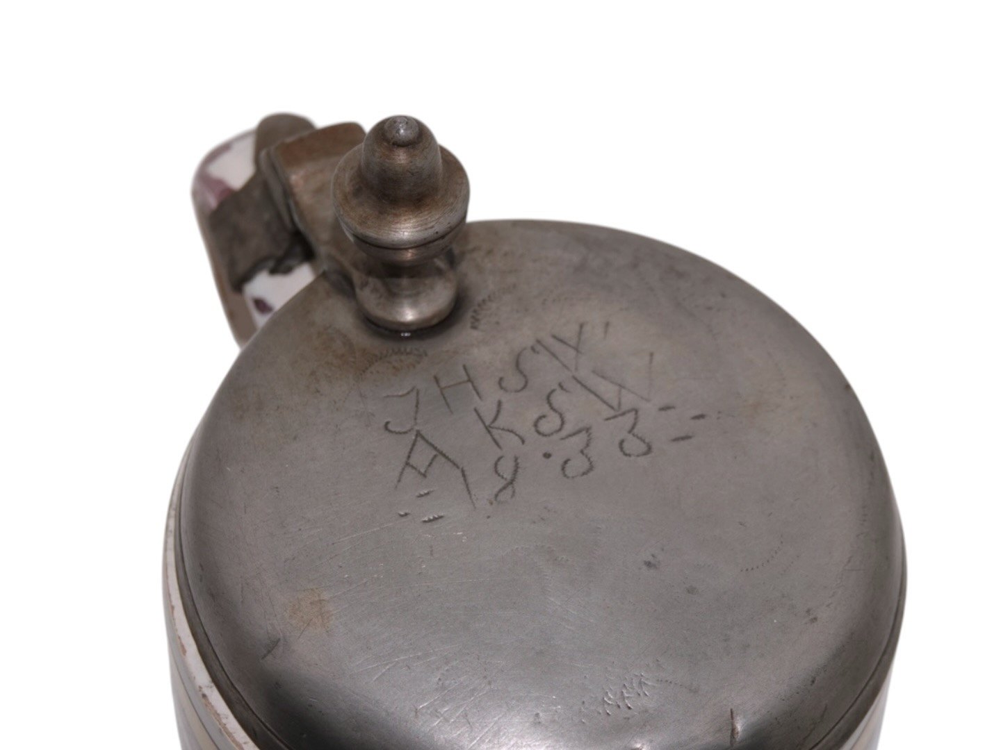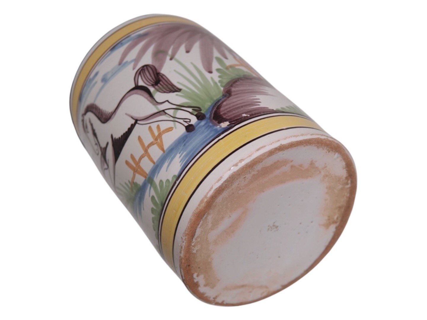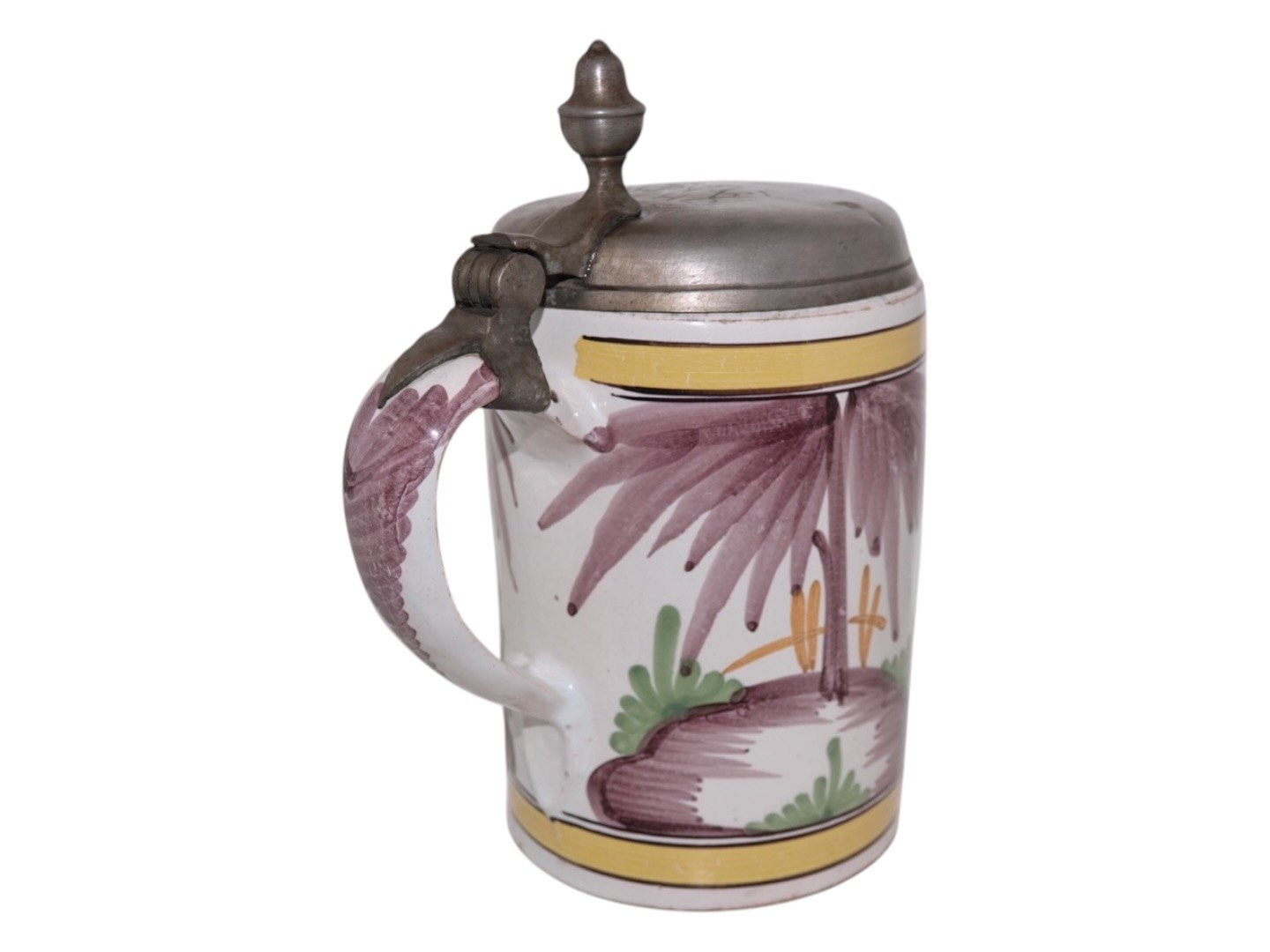 Kellinghusen / Bahlmann, Lubbert Diedrich.Stort fajance krus dekoreret med en hest. Der er et tinlåg der har senere inskription fra 1833. Kruset er fremstillet mellem 1790 og 1810.