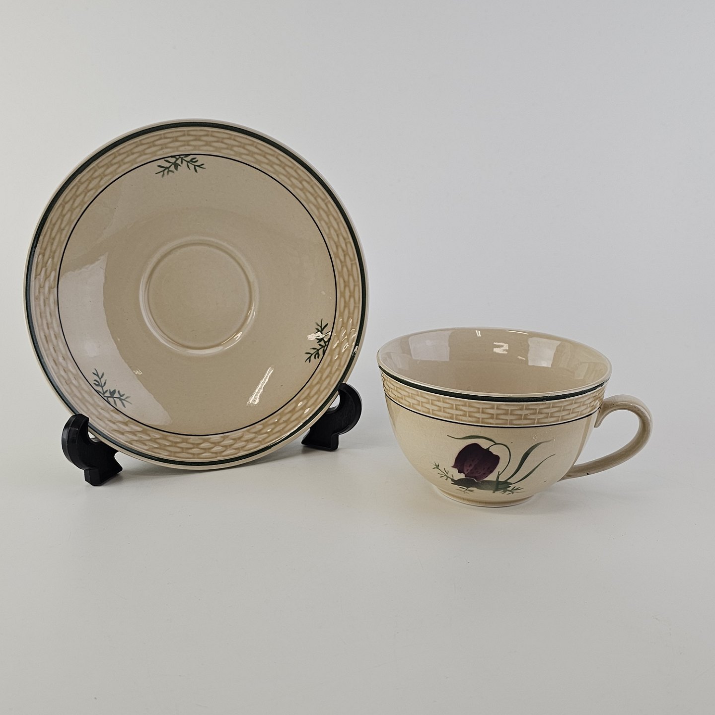 Fajancestel i stelform Viktoria II (Fletværk) med flettet kant og dekoration af en vibeæg blomst i violet og grøn, fremstillet i perioden 1934-1967
