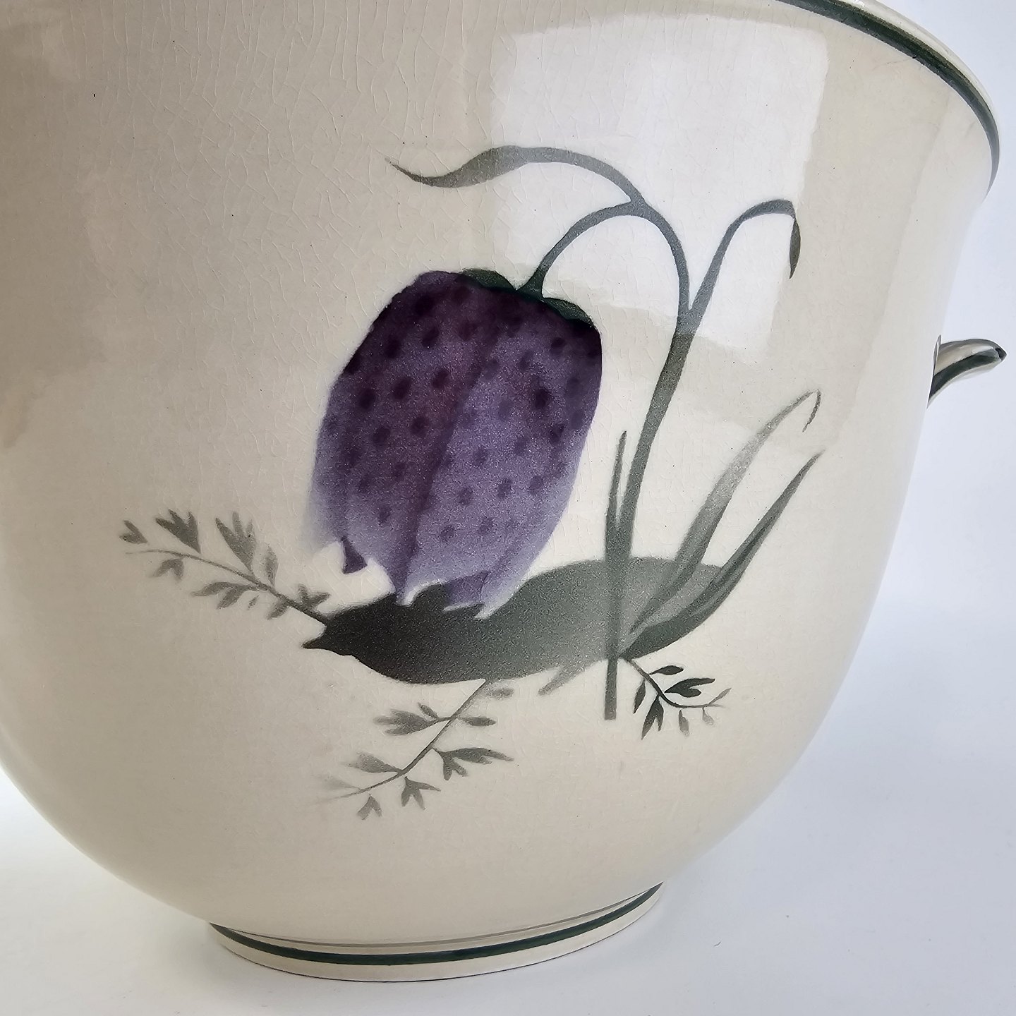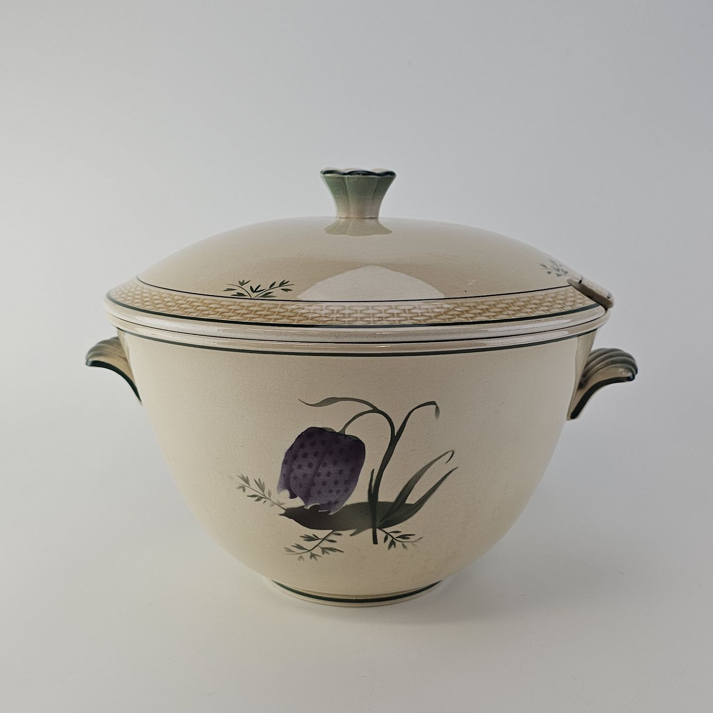 Fajancestel i stelform Viktoria II (Fletværk) med flettet kant og dekoration af en vibeæg blomst i violet og grøn, fremstillet i perioden 1934-1967