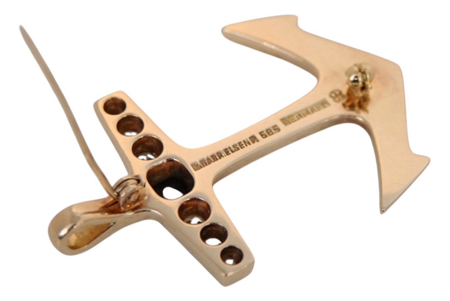 Bent Gabrielsen 14 karat guld stort vedhæng i form af anker med en ret stor blå safir og seks store safirer. Smykket er udført i en lækker tung kvalitet. Smykket kan både benyttes som en broche samt et vedhæng, da der både er øje til kæde samt nål.BEMÆRK SMYKKET ER I EKSTERN BANKBOKS OG KAN KUN BESES EFTER AFTALE EN DSG I FORVEJEN.