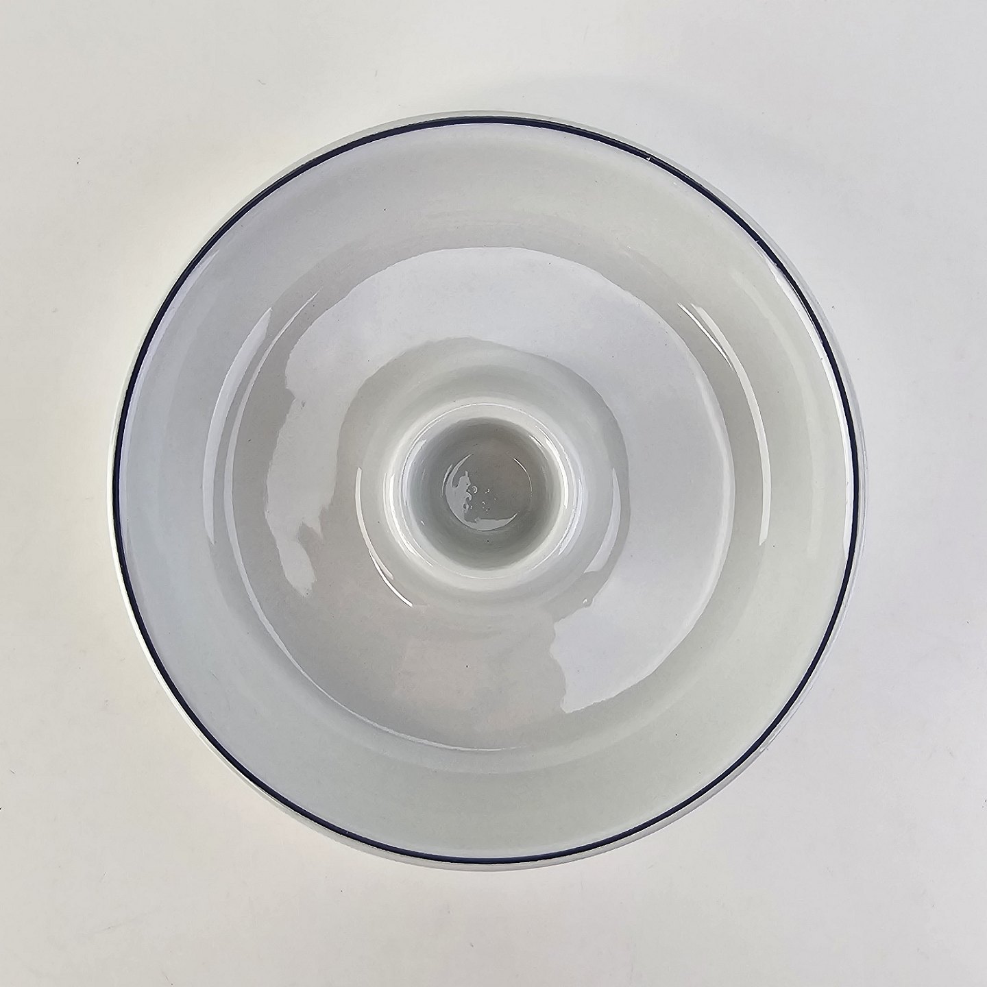 Blåkant er stel i hvid fajance med dekoration af en blå streg på kanten