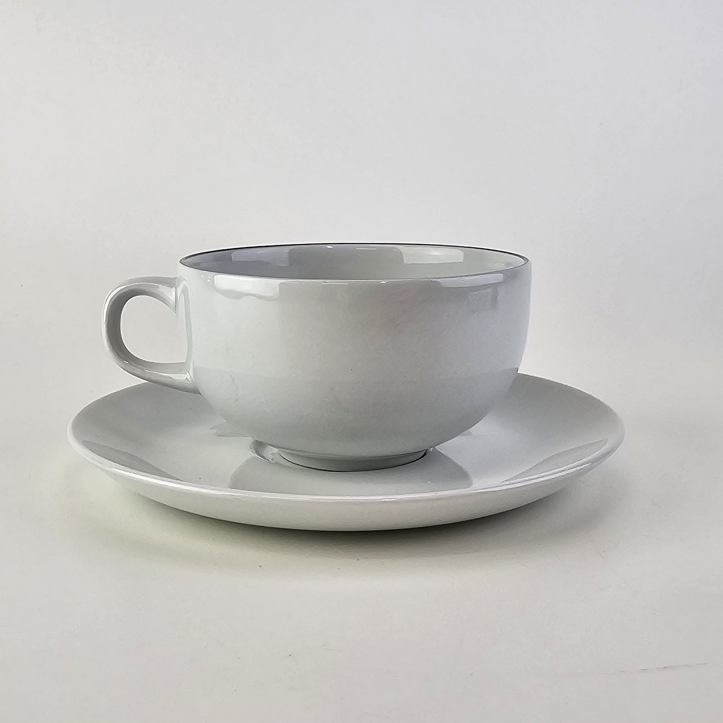 Blåkant er stel i hvid fajance med dekoration af en blå streg på kanten