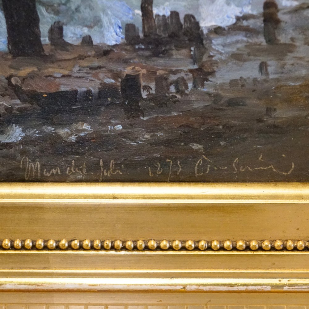 Mariner maleri af Carl Frederik Sørensen, motiv ved Mandal i Norge, juli 1873. Olie på lærred. Signeret "C. F. Sørensen" derudover indridset "Mandal Norge juli 1973".Med guldramme.