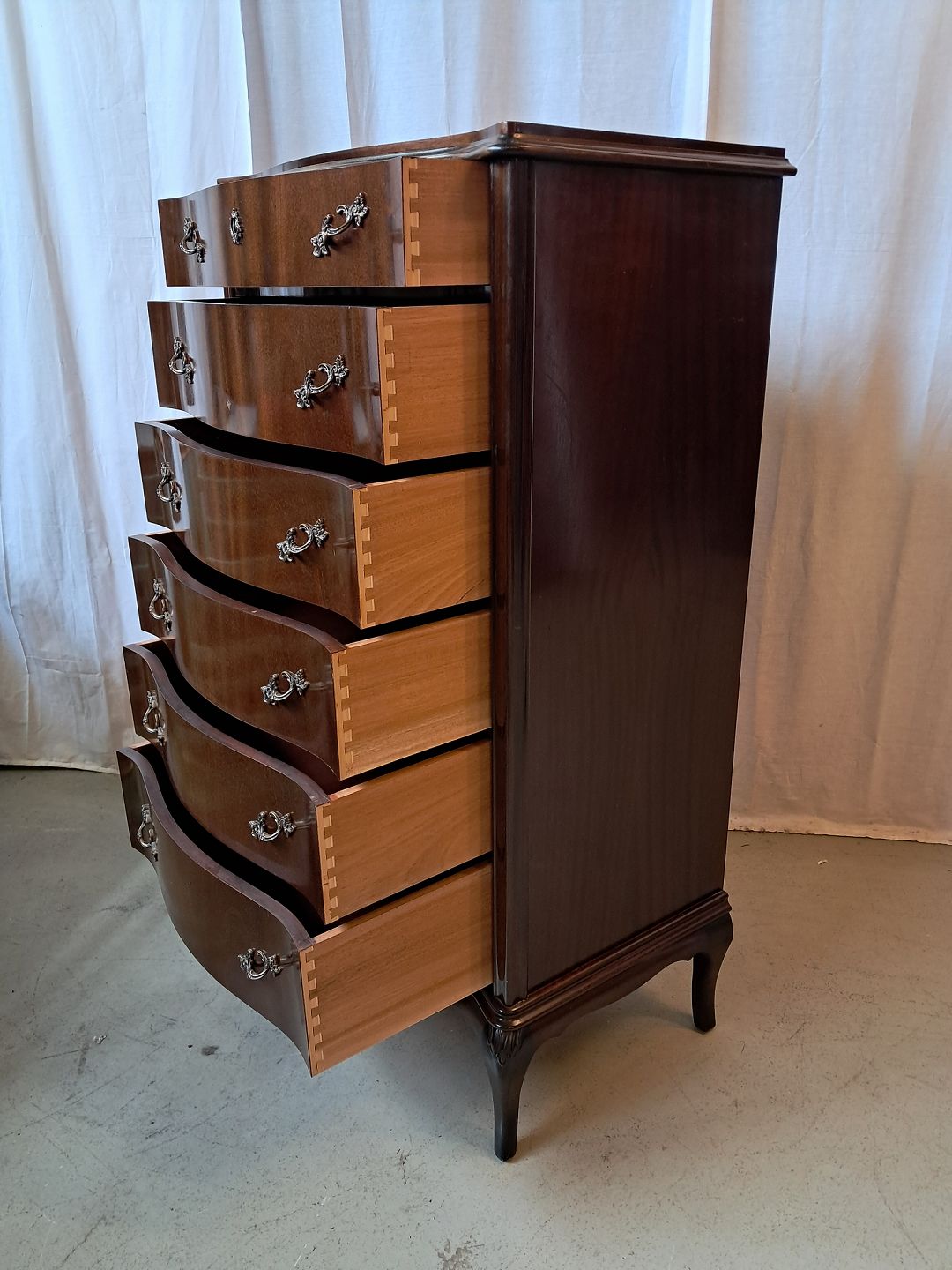 Kommode i fineret nødetræ, fra 1950erne.Den har brugsspor.