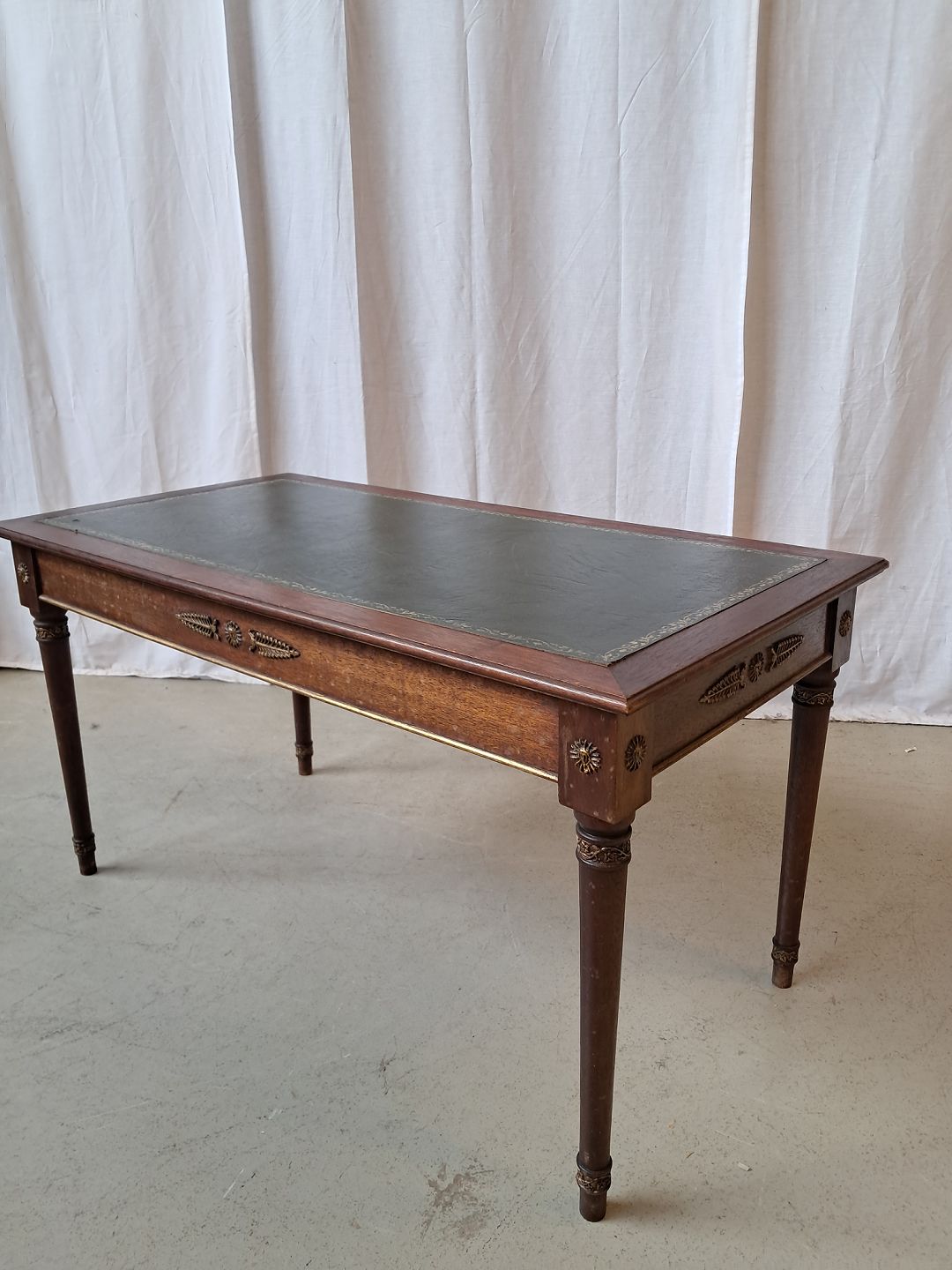 Sofabord i fineret mahogni med kunstlæder indlæg, fra 1980erne.Det har brugsspor.