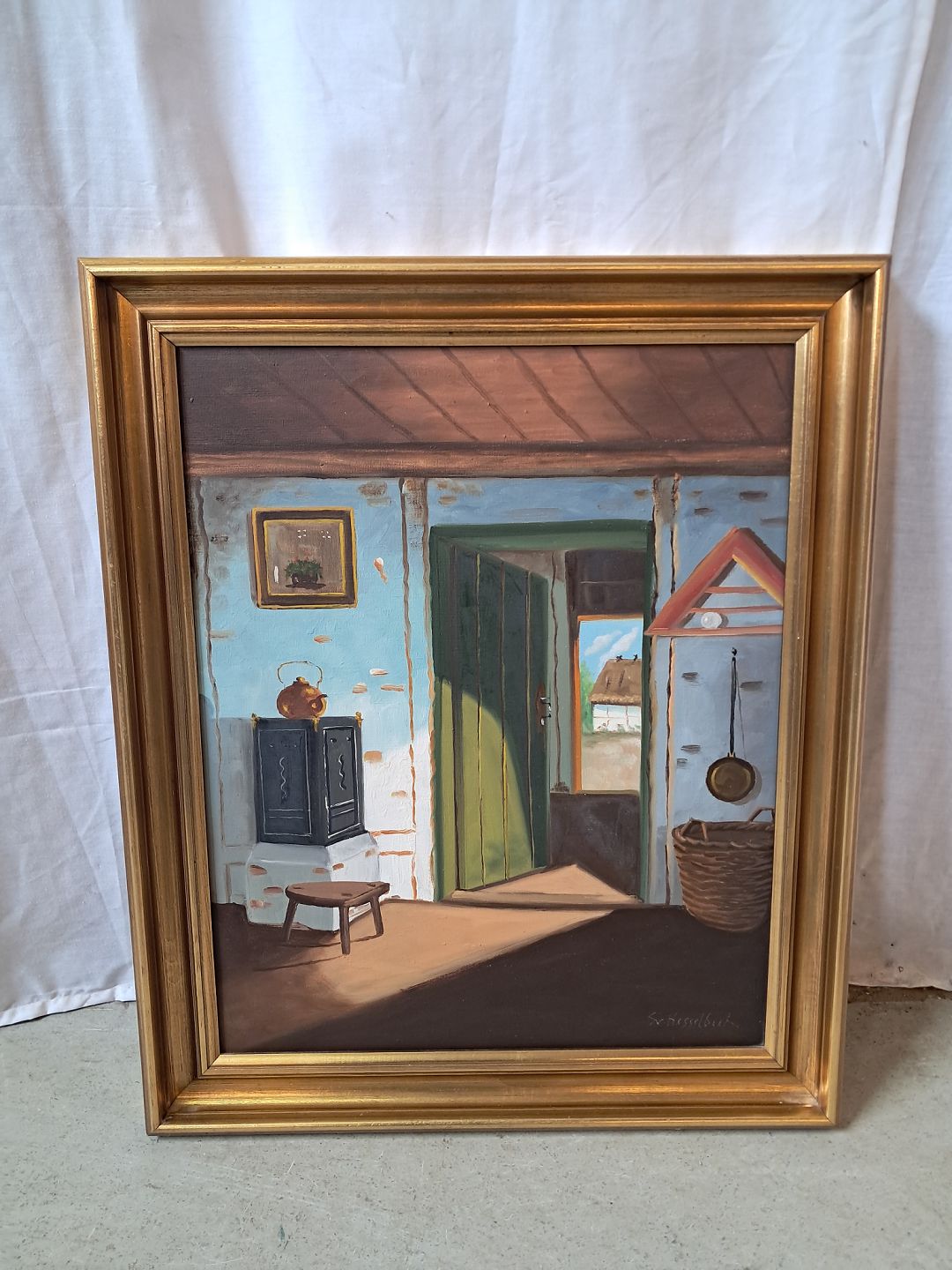 Maleri i guldmalet ramme, fra 1960erne.Det har brugsspor.