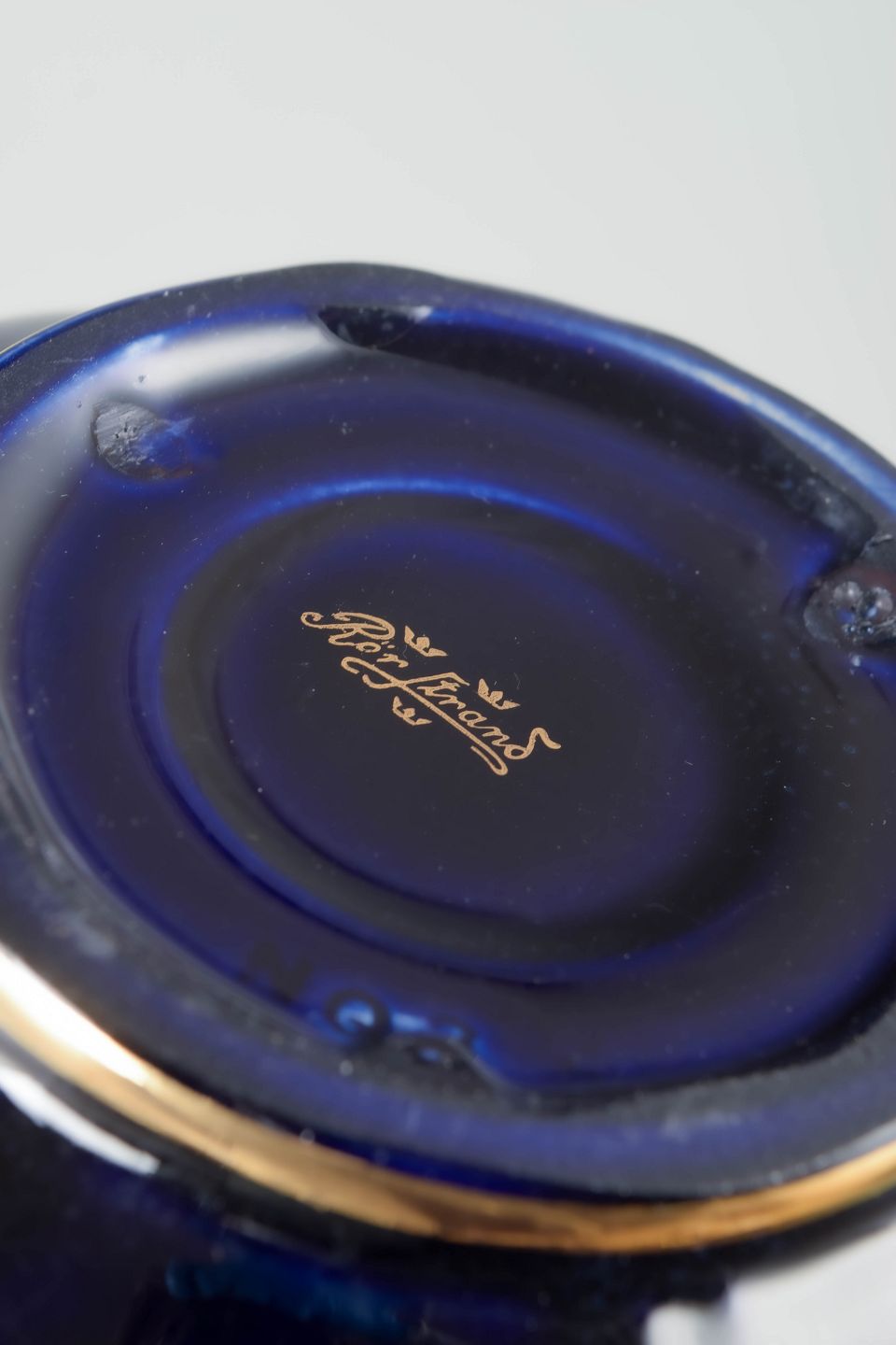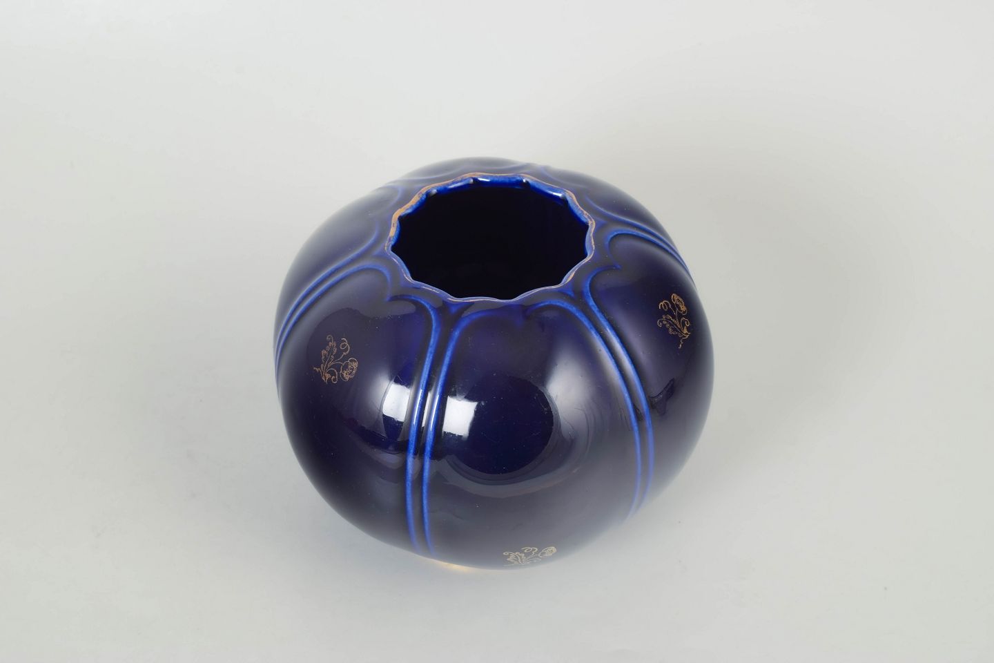 Rörstrand vase.Kugleformet vase i porcelæn med dyb koboltblå glasur, dekoreret med lodrette linjer og guldkant ved foden.