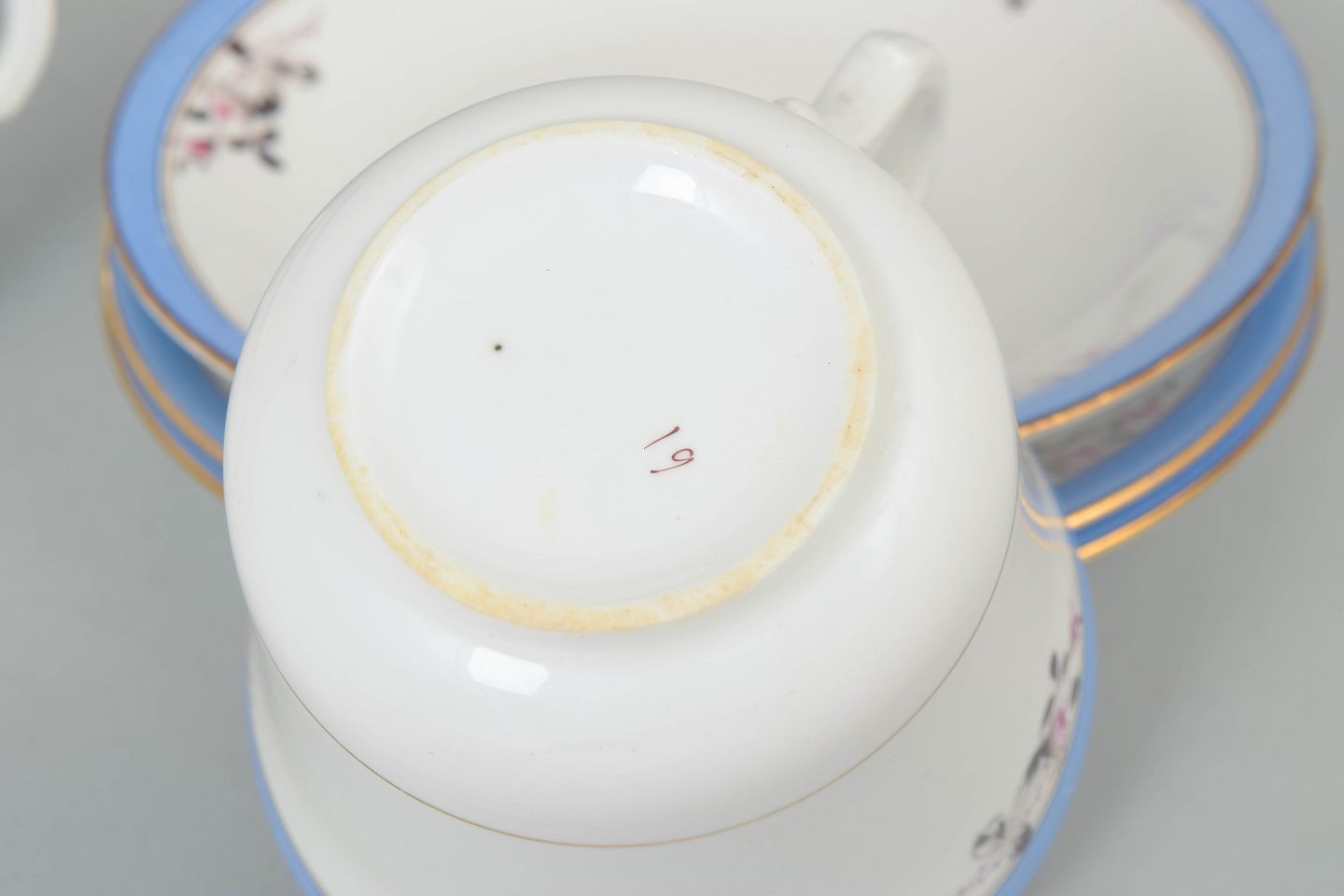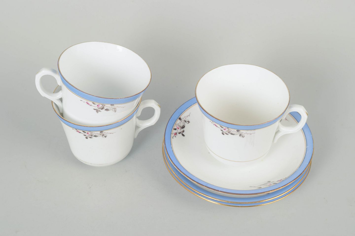 Elegant porcelænssæt med lyseblå kant og fin blomsterdekoration. Model “Carlstad” fremstår med klassisk formsprog fra perioden.