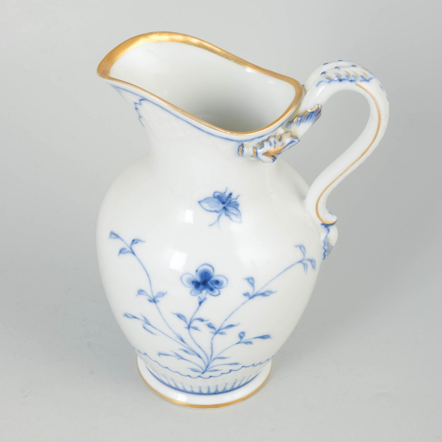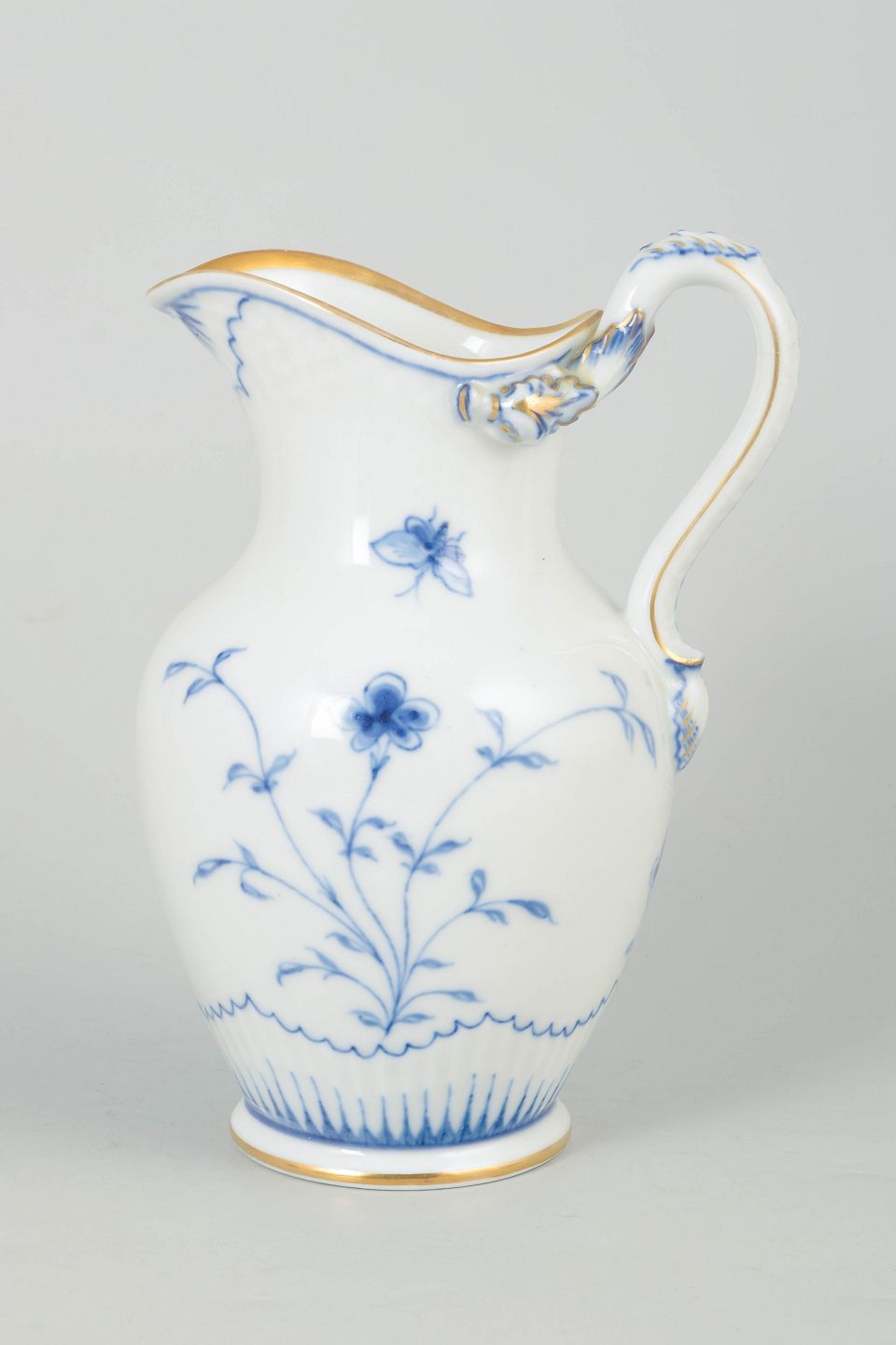Bing & Grøndahl, sommerfugl kandeElegant kande i porcelæn fra sommerfugl-serien med håndmalet dekoration i underglasurblå med stiliserede blomster og sommerfugl samt forgyldte detaljer langs kant og hank.