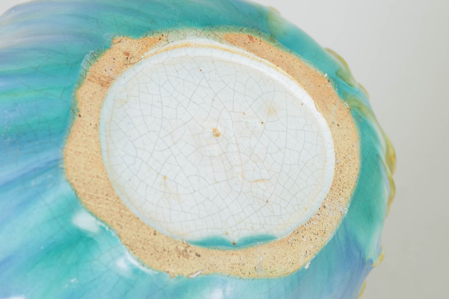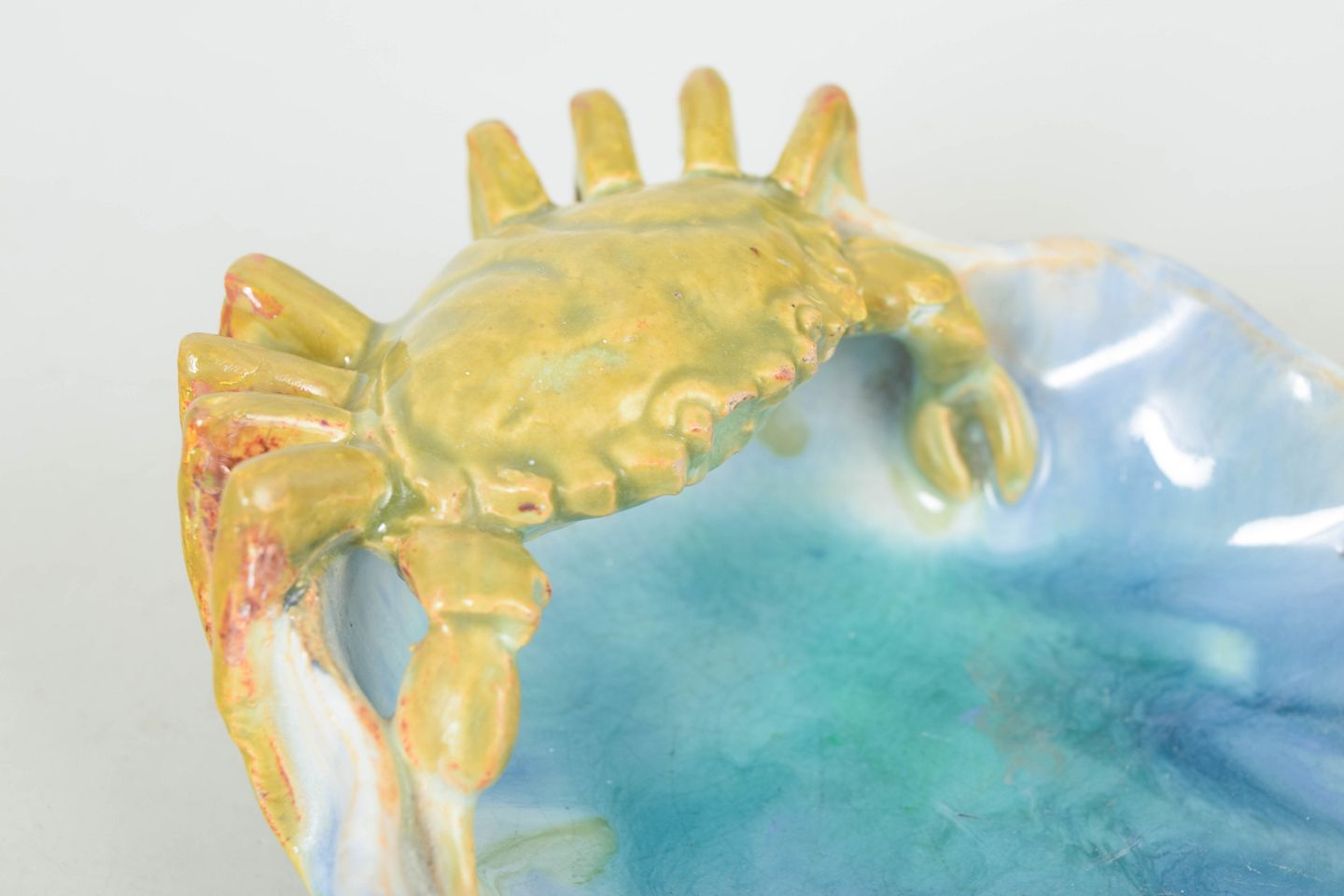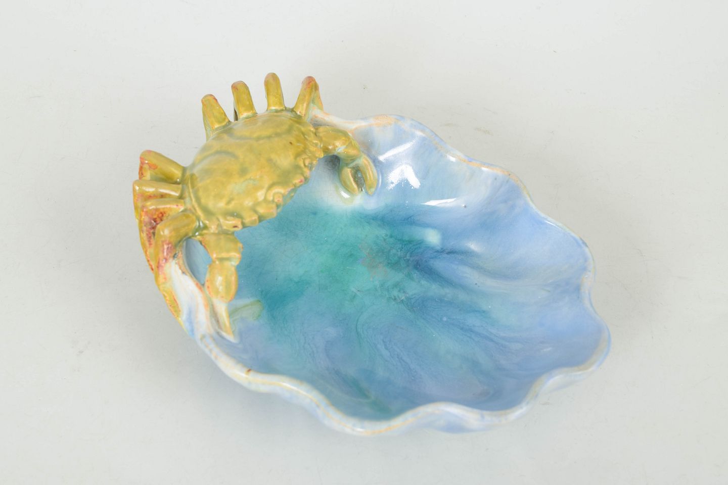 Skandinavisk art nouveau skål.Organisk formet skål i keramik med bølget rand og integreret krabbemotiv, udført i iriserende glasur med nuancer i blå, grøn og gylden. Mærket utydeligt.