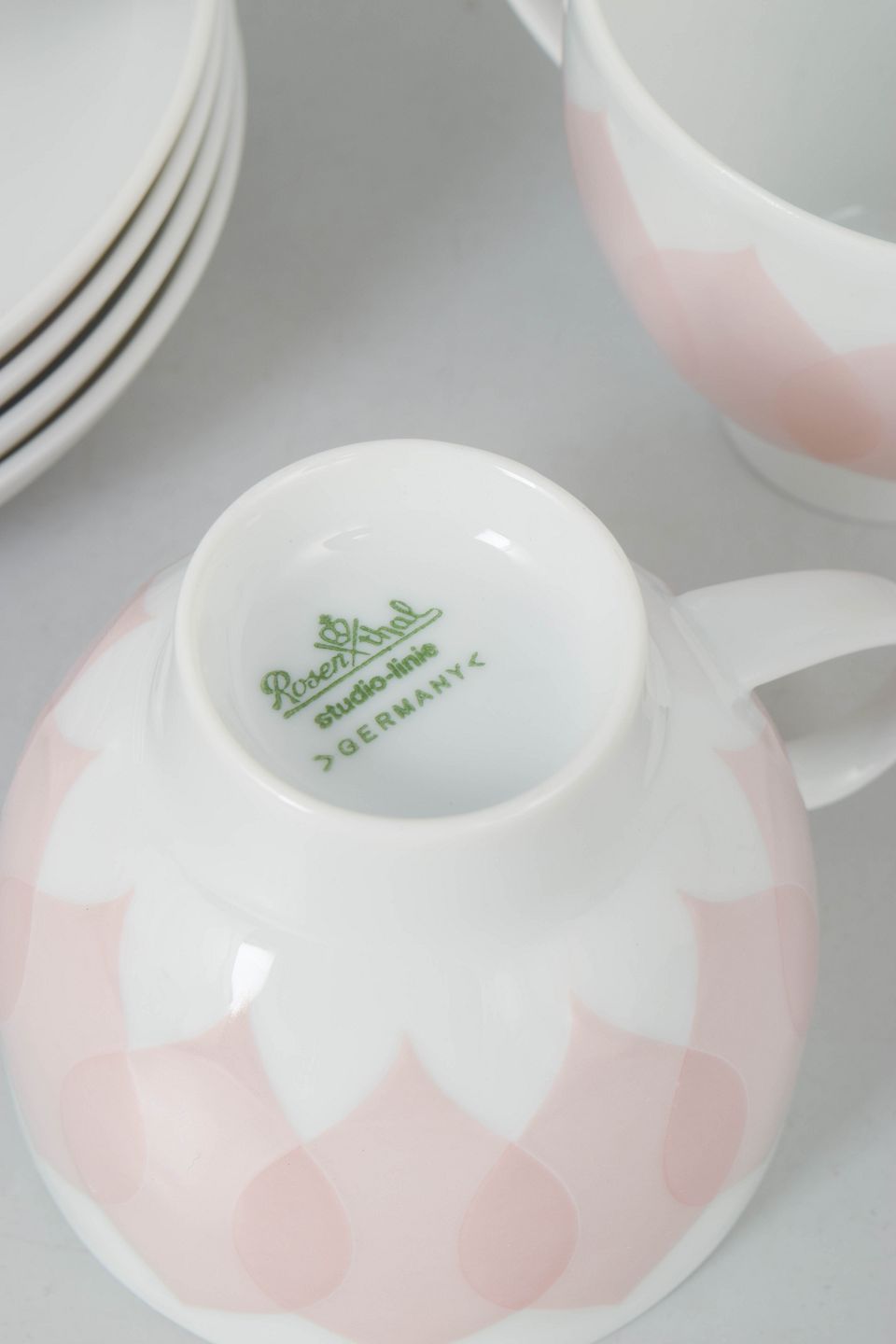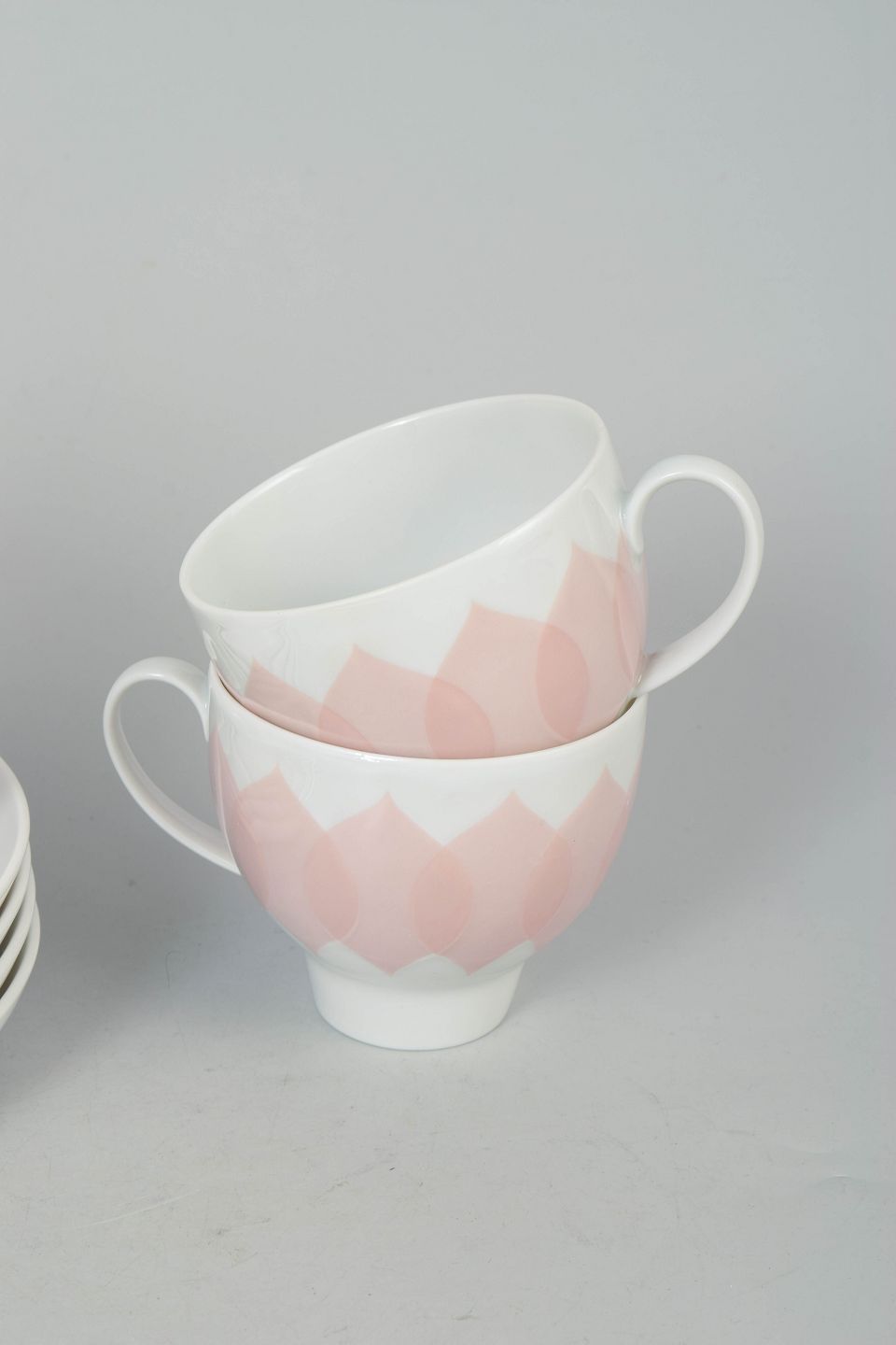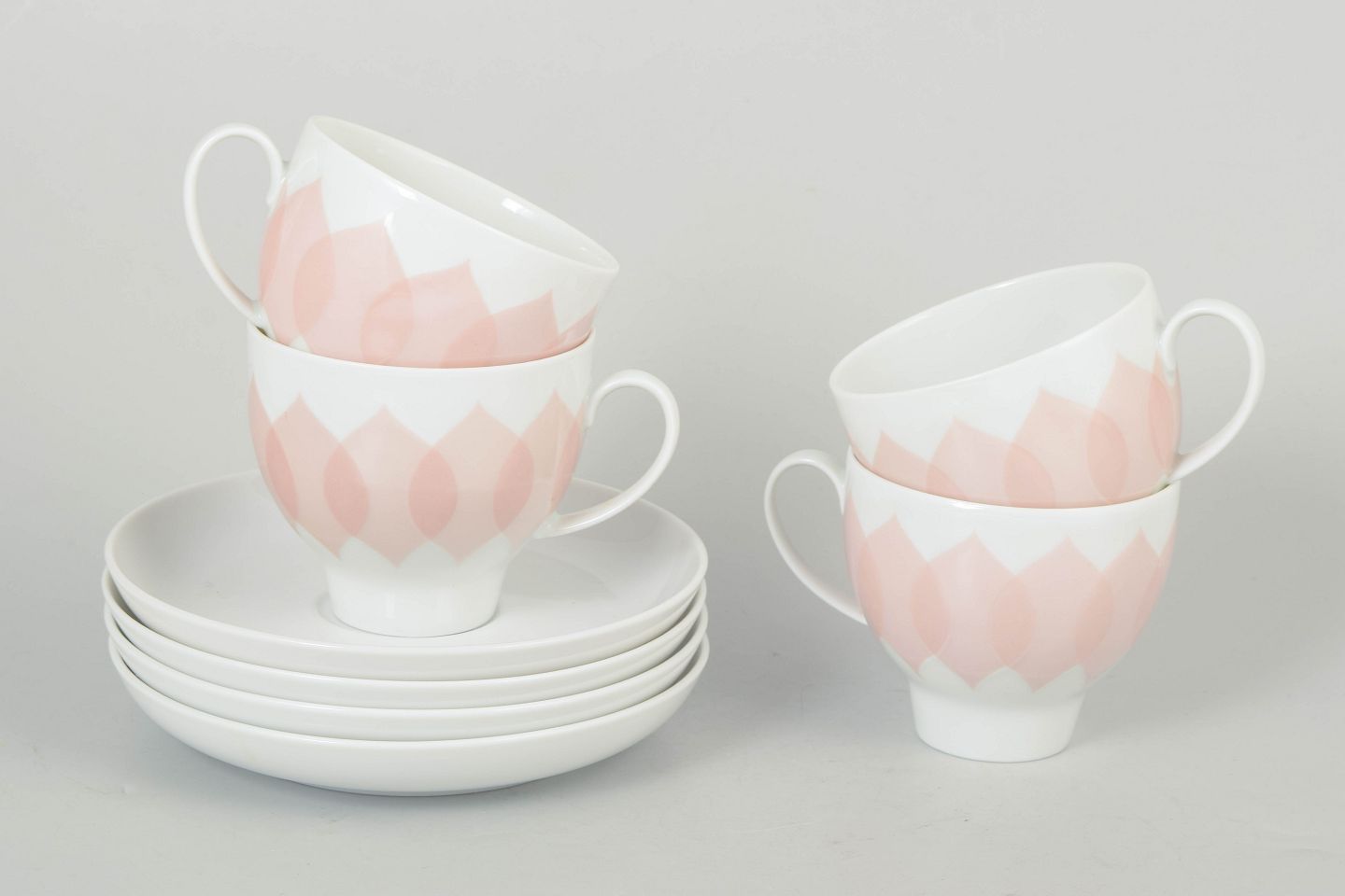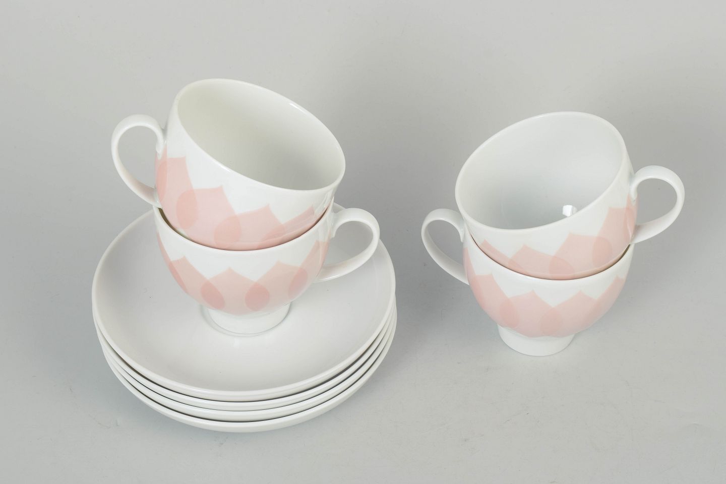 Bjørn Wiinblad for Rosenthal, sæt af fire kaffekopper med tilhørende underkopper.Sæt bestående af fire kaffekopper med matchende underkopper i porcelæn med rosa “Lotus” dekoration, udført med gentaget bladmotiv i bløde nuancer og et karakteristisk dekorativt udtryk.