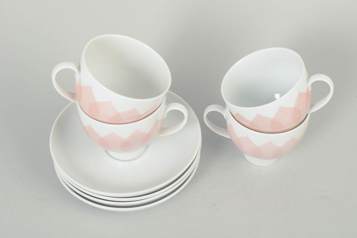 Bjørn Wiinblad for Rosenthal, sæt af fire kaffekopper med tilhørende underkopper.Sæt bestående af fire kaffekopper med matchende underkopper i porcelæn med rosa “Lotus” dekoration, udført med gentaget bladmotiv i bløde nuancer og et karakteristisk dekorativt udtryk.