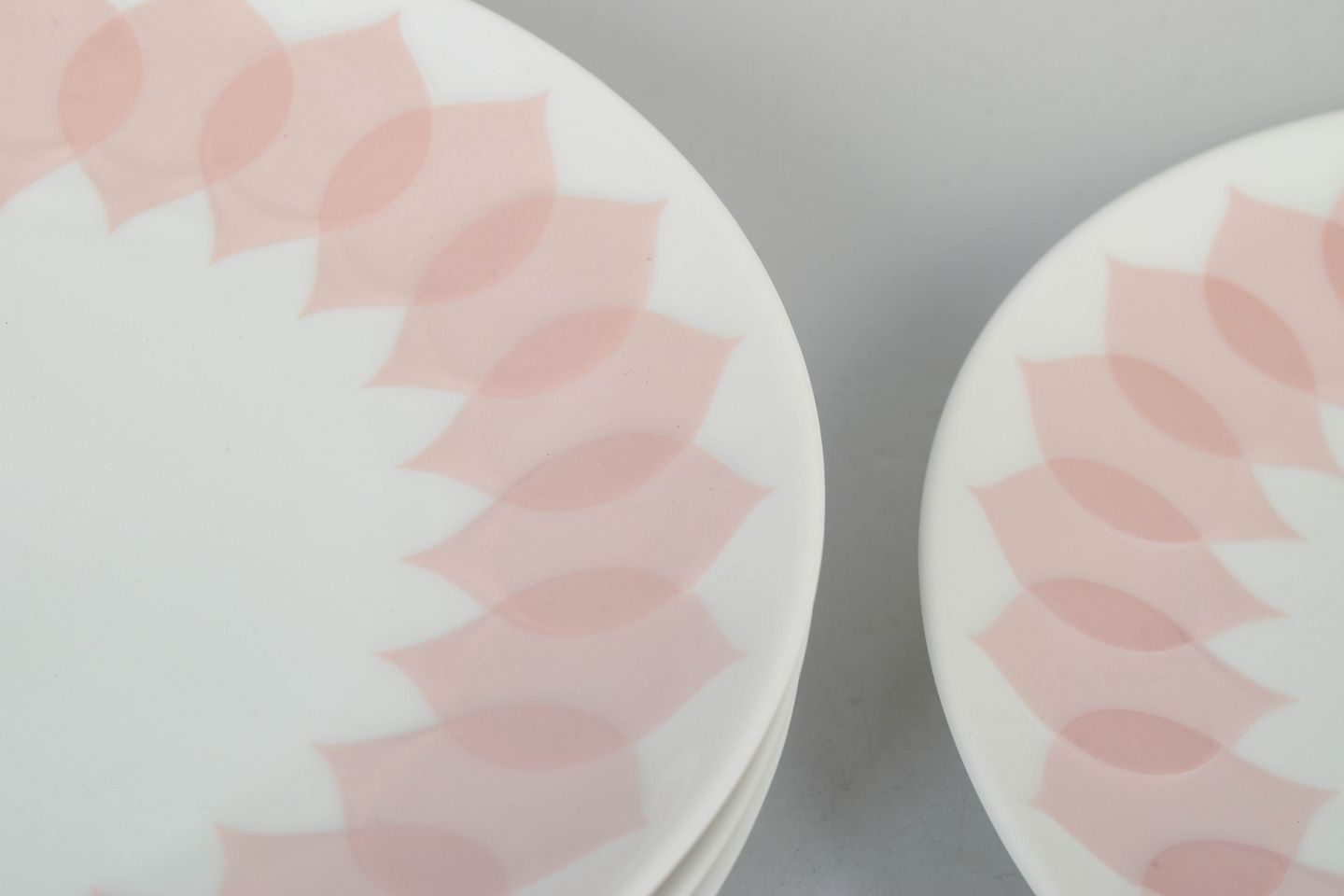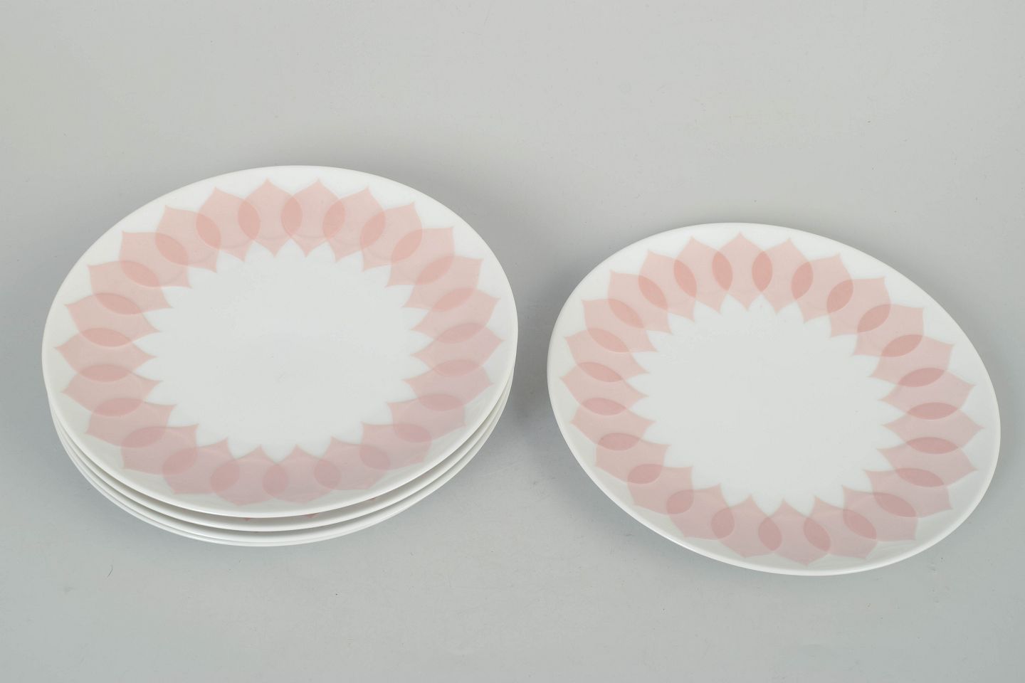 Bjørn Wiinblad for Rosenthal, sæt af fem tallerkener.Fem tallerkener i porcelæn med rosa “Lotus” dekoration, udført med gentaget bladmotiv langs kanten i bløde nuancer og et karakteristisk dekorativt udtryk.