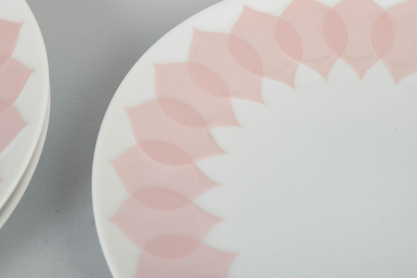 Fire tallerkener i porcelæn med rosa “Lotus” dekoration, udført med gentaget bladmotiv langs kanten i bløde nuancer og et karakteristisk dekorativt udtryk.