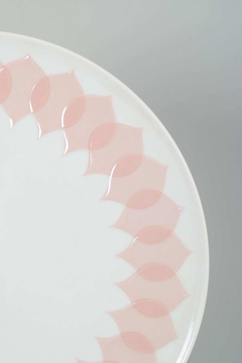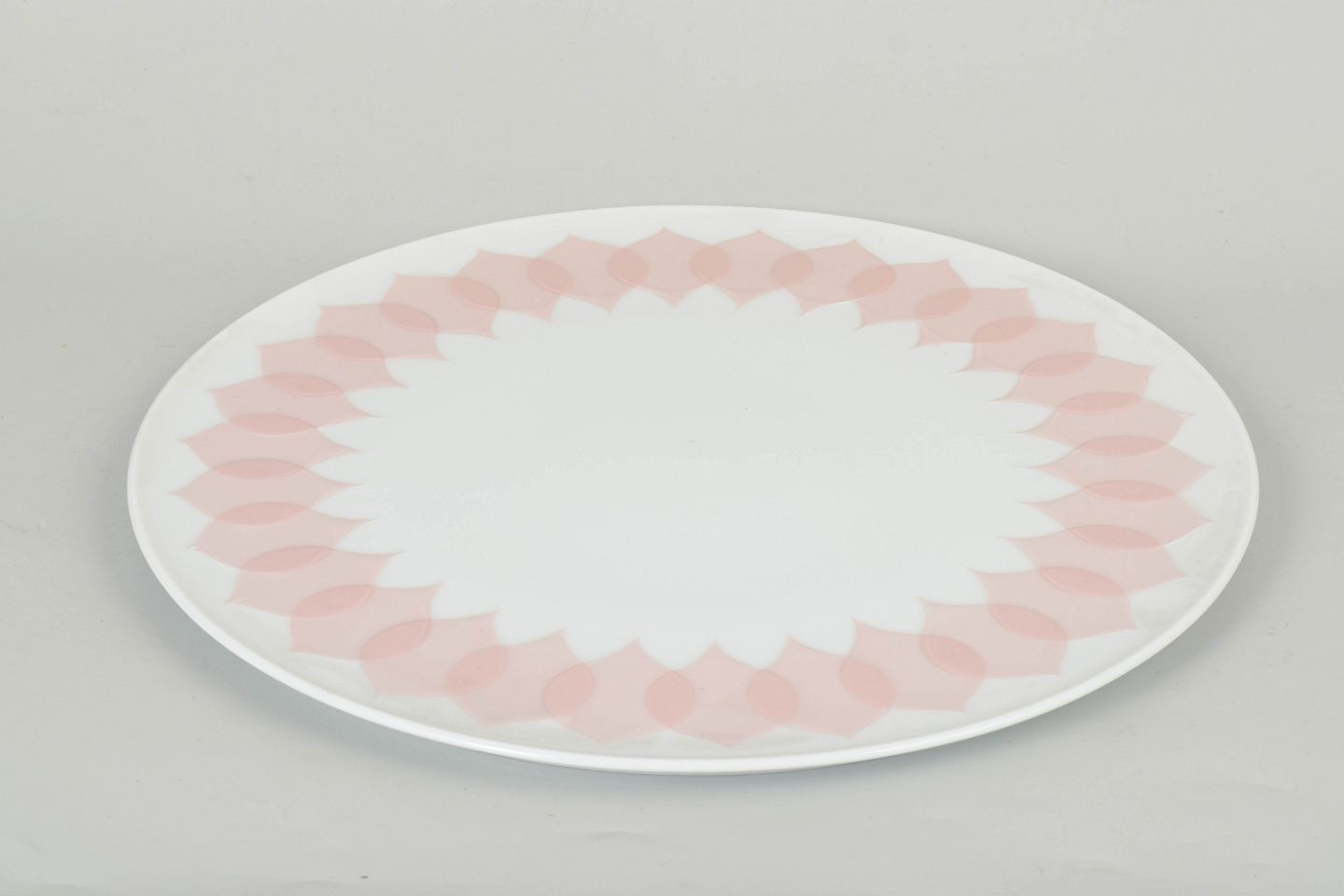 Bjørn Wiinblad for Rosenthal, rundt serveringsfad.Rundt serveringsfad i porcelæn med rosa “Lotus” dekoration, udført med gentaget bladmotiv langs kanten i bløde nuancer og et karakteristisk dekorativt udtryk.