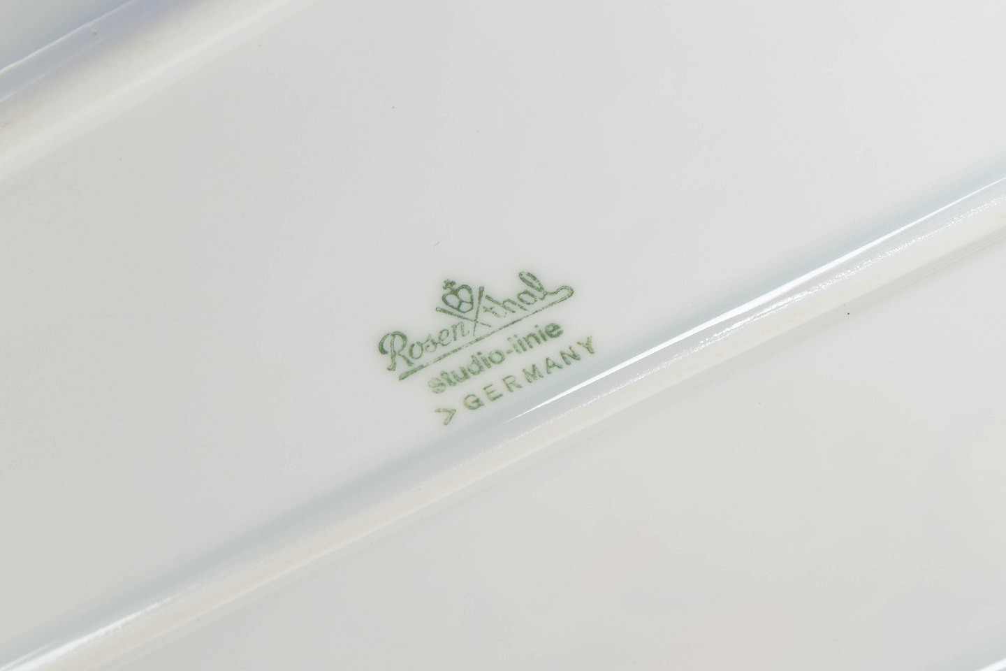 Bjørn Wiinblad for Rosenthal, oval fad.Dekorativt ovalt porcelænsfad med karakteristisk rosa “Lotus” dekoration langs kanten, udført i et gentaget bladmotiv med bløde overgange og grafisk rytme.