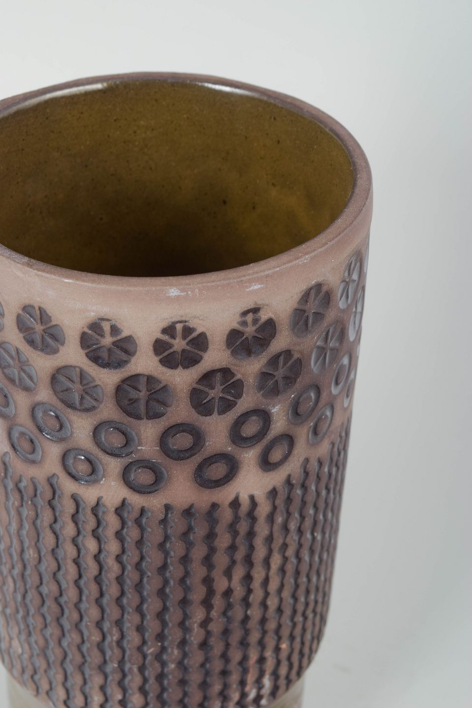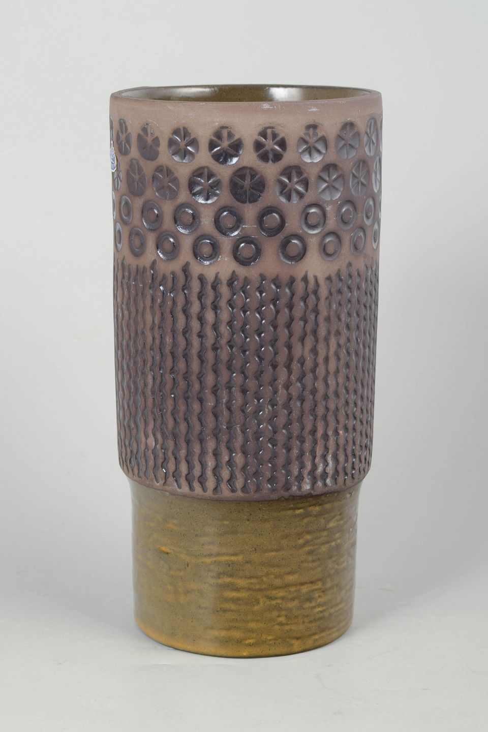 Mari Simmulson for Upsala Ekeby, vase.Høj cylindrisk keramikvase model 6074M med reliefdekoreret overflade i geometriske mønstre og håndglaserede nuancer i rosa, grå og olivengrøn.