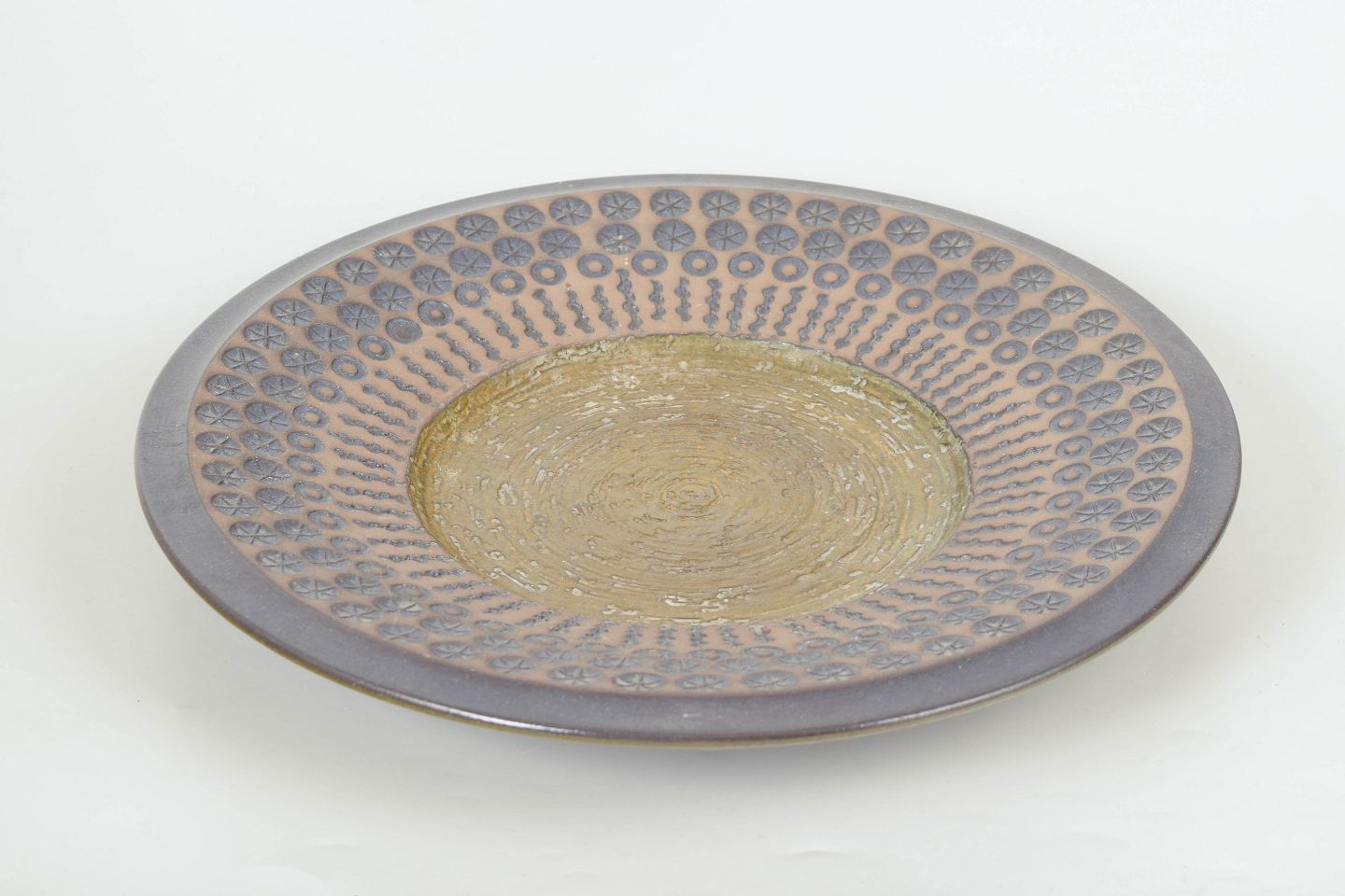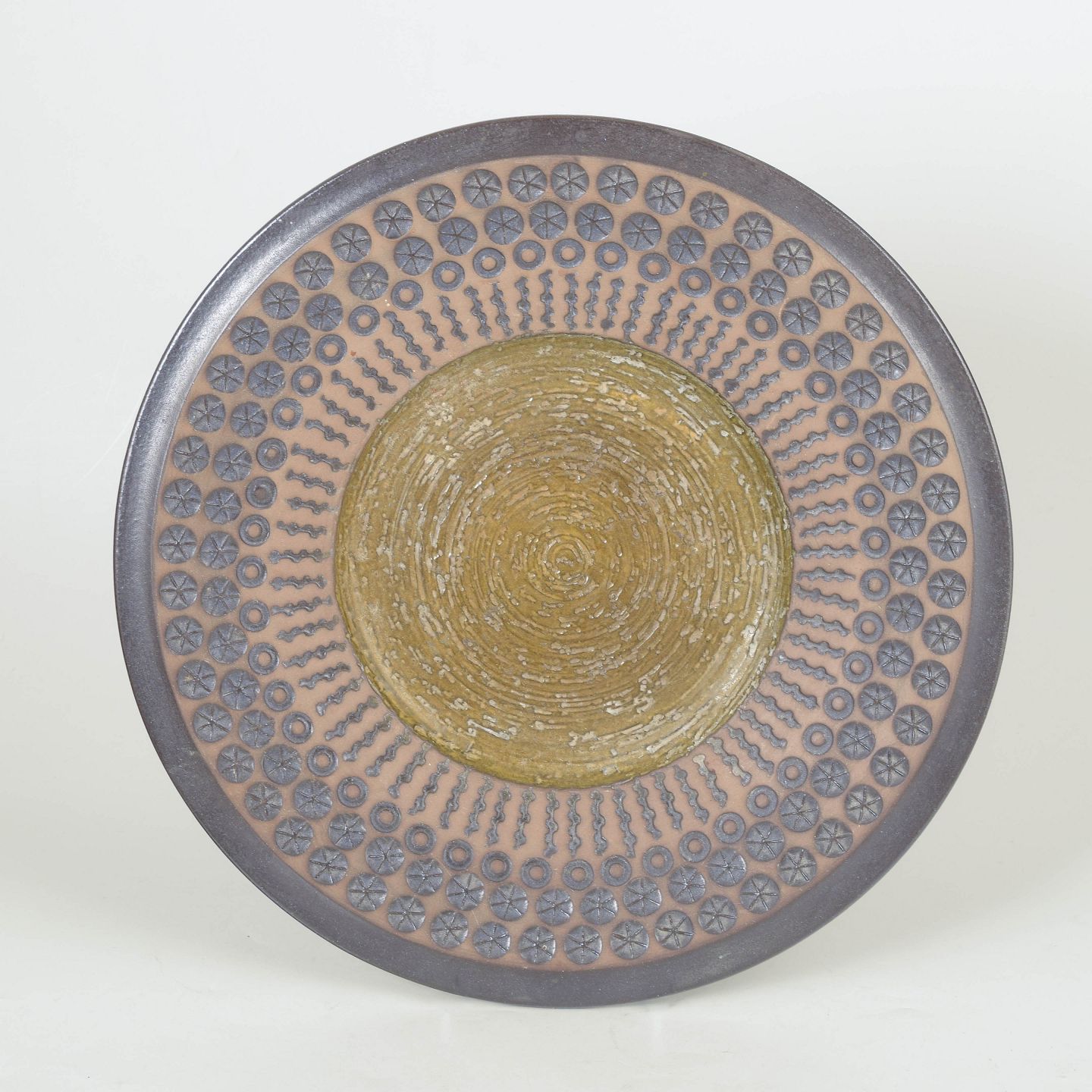 Mari Simmulson for Upsala Ekeby, fad.Stort rundt keramikfad model 6071M med geometrisk reliefdekoration i koncentriske mønstre og håndglaserede jordfarver i rosa, grå og olivengrønne nuancer.