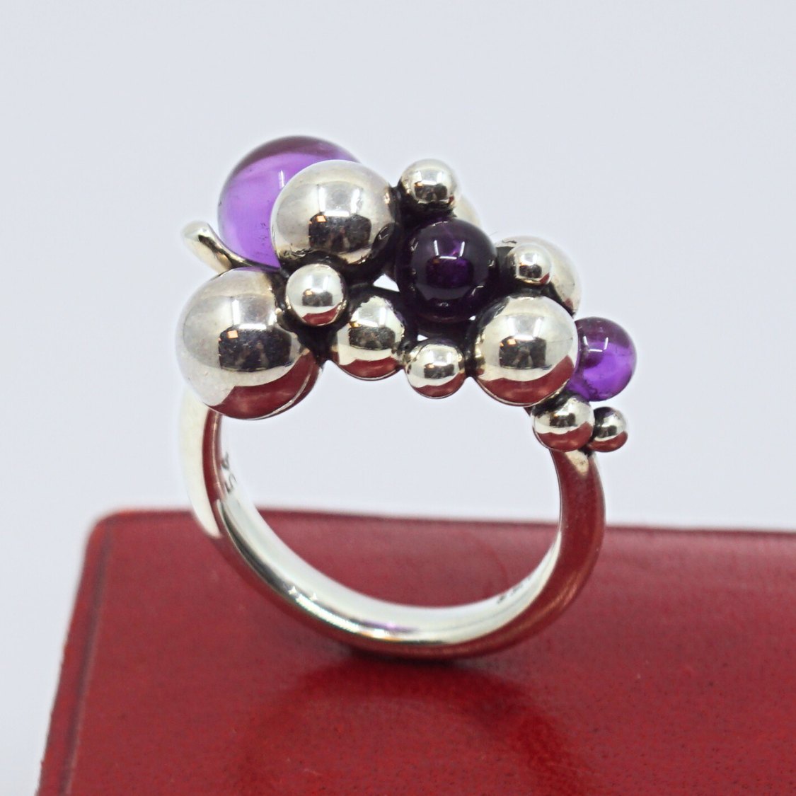 Georg Jensen; A Moonlight grapes ring in sterling silver set with amethysts. Ring size 54.
