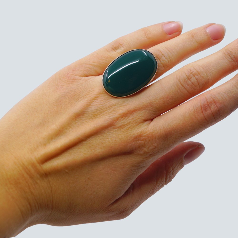Georg Jensen; Ring af sterling sølv prydet med stor oval grøn agat.