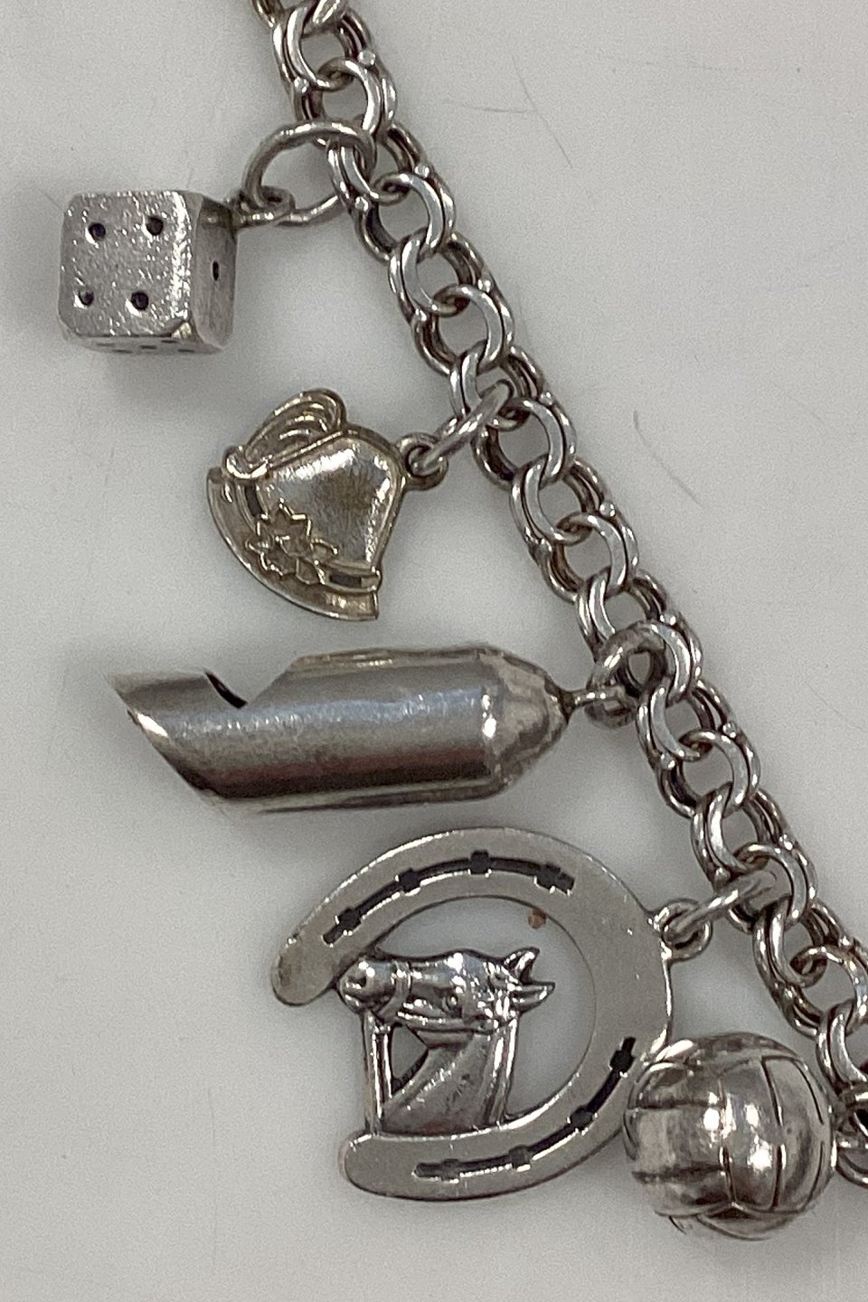 Dansk Bismarck armbånd i sterling sølv med forskellige vedhæng, Terning, Alpehat, Fløjte, Hestesko, Bold, Pige med paraply, og Gris