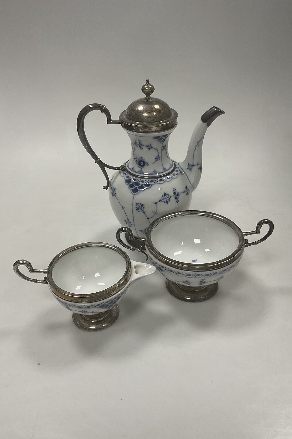 Royal Copenhagen Halvblonde Kaffekande, flødekande og sukkerskål med metal montering