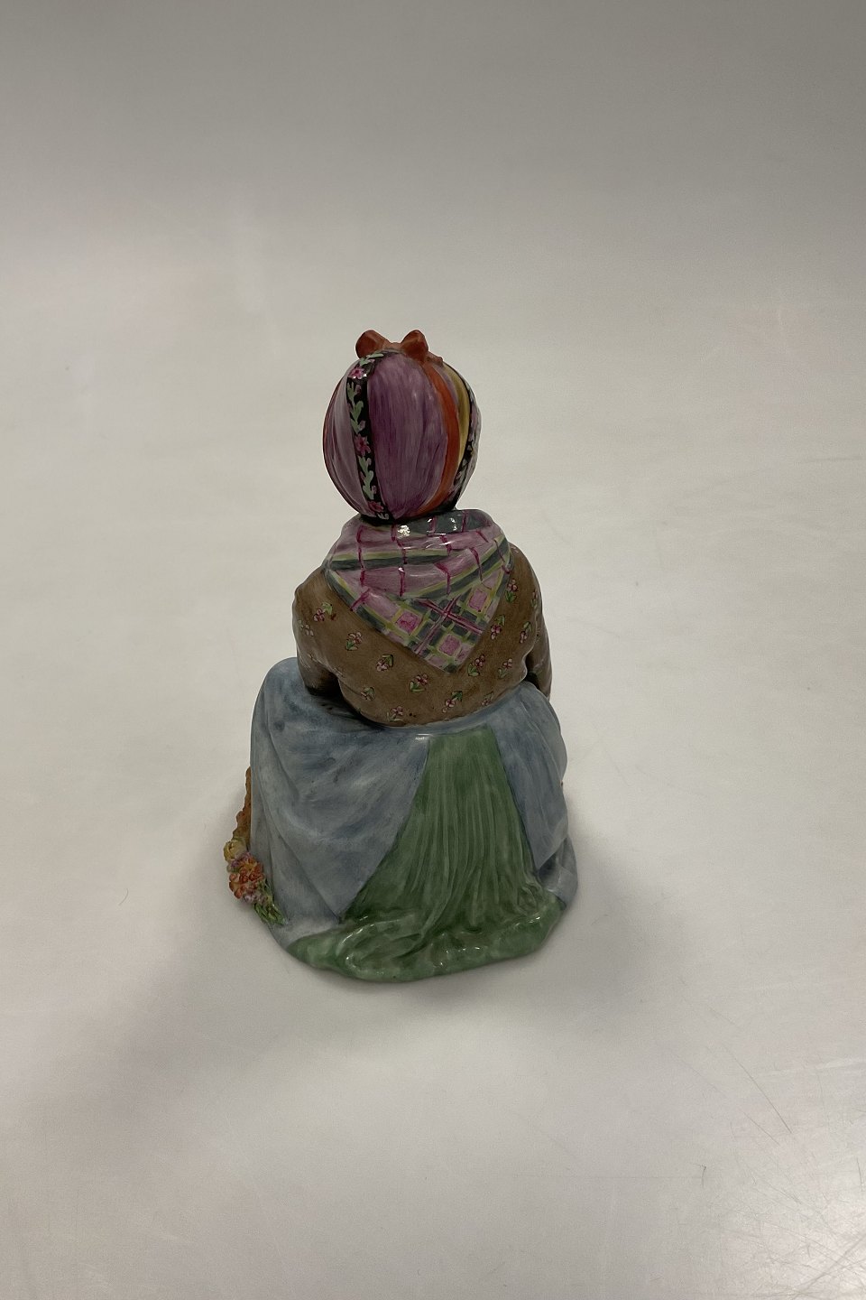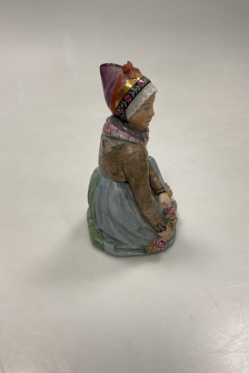 Royal Copenhagen Siddende Fanøpige af Carl Martin-Hansen No. 12413. Med Juliane Marie stempel. Måler 14,5 cm. 1. sortering, med små afslag på blomster - se billeder