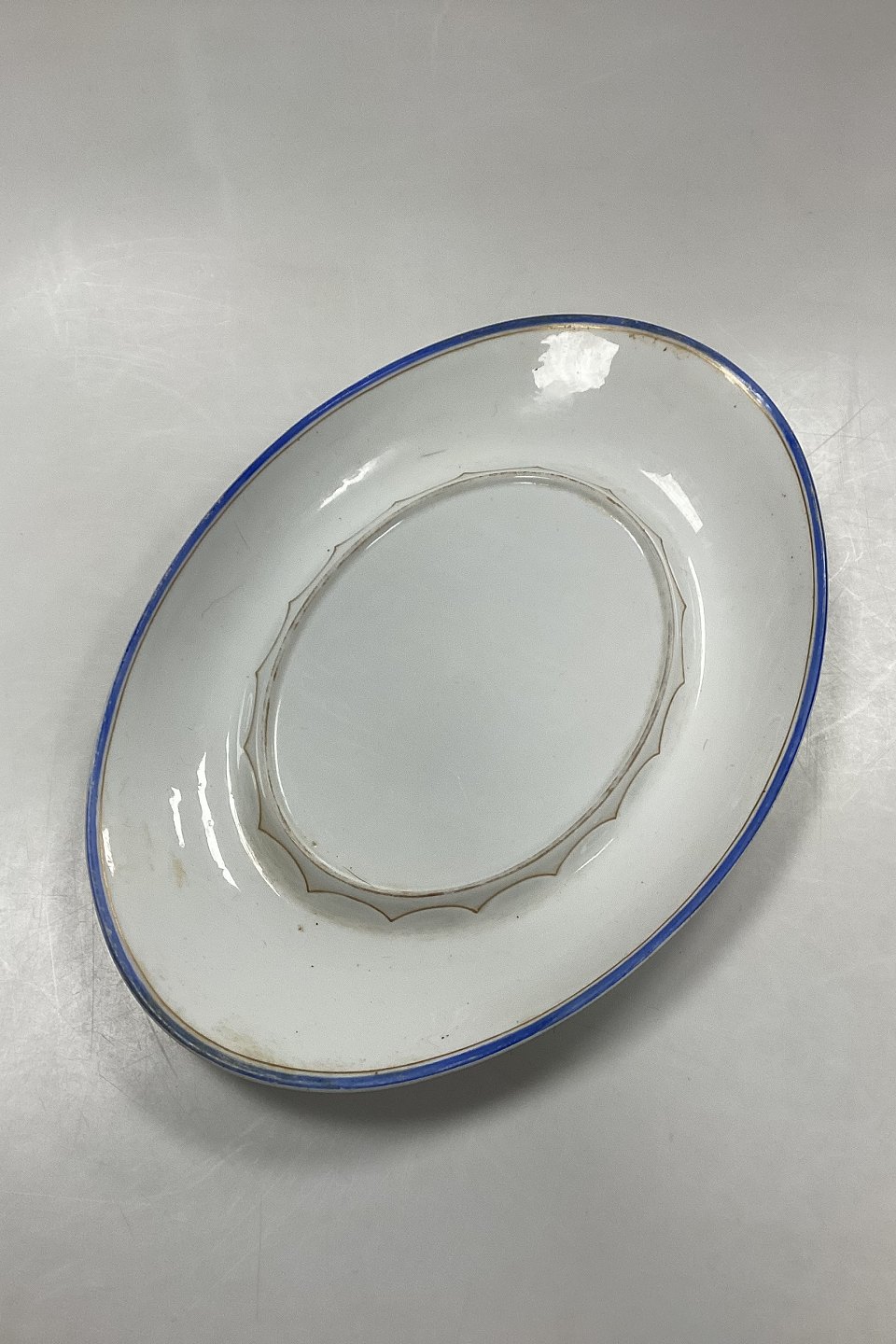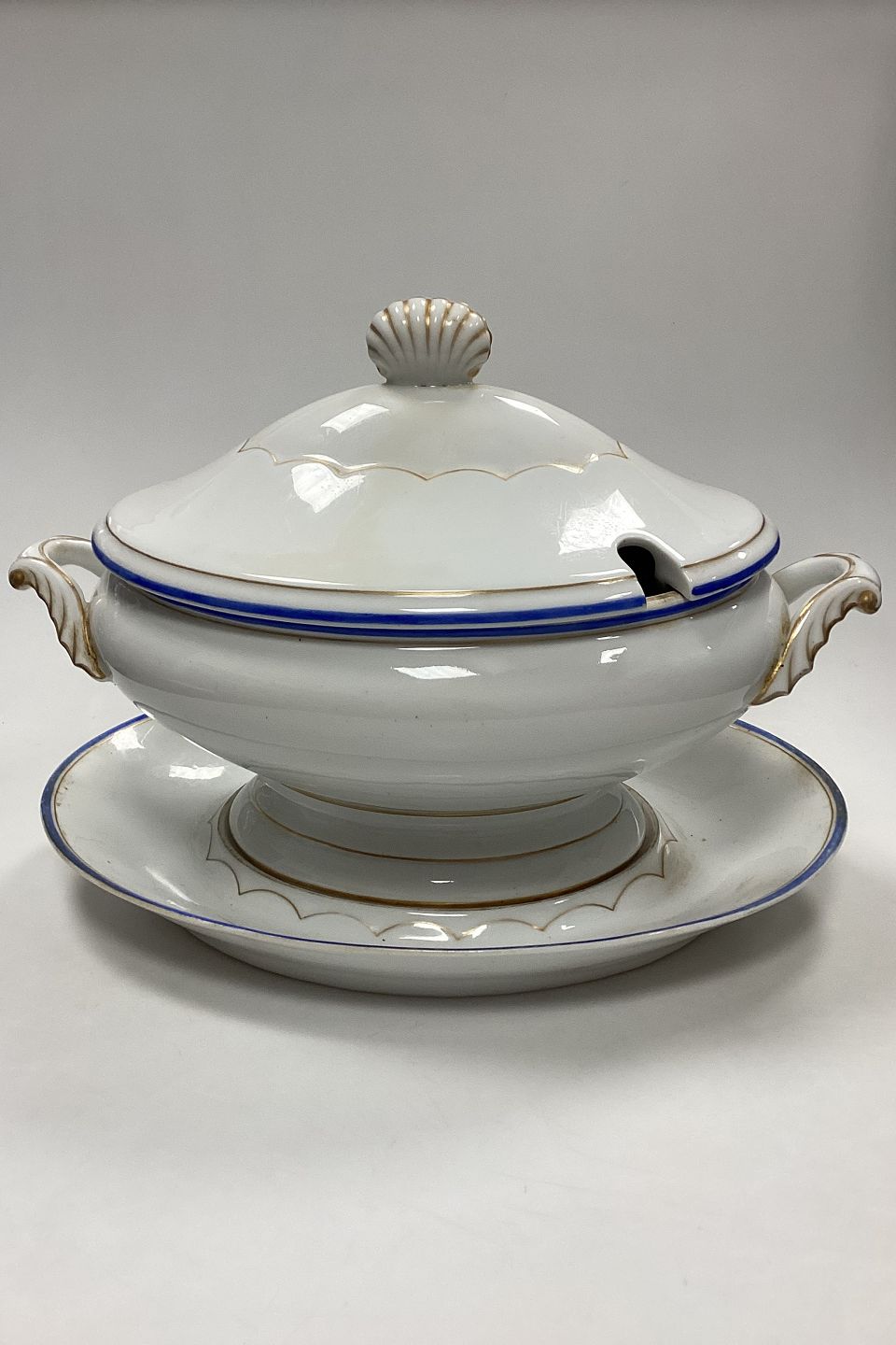 Royal Copenhagen Terrin med Underfad No. 282/9056 og 9057. Hvidt porcelæn med dekoration i guld og koboltblå. Lettere slid på guld og kanter.