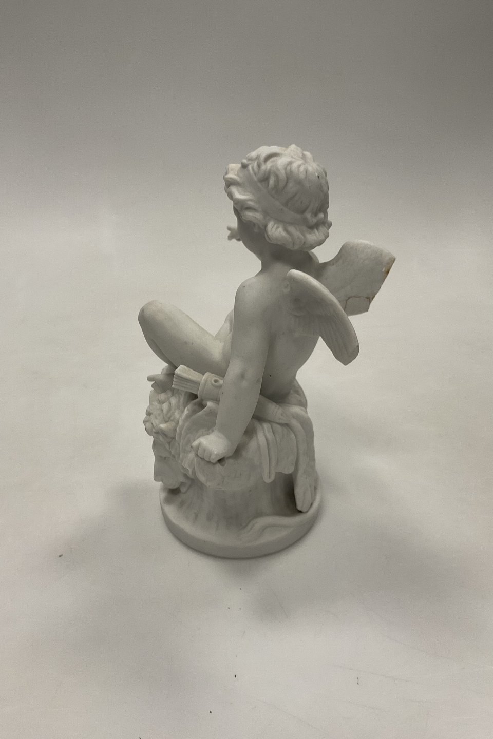 Figur har slag på finger og vinger. Mangler bue og afslag på base