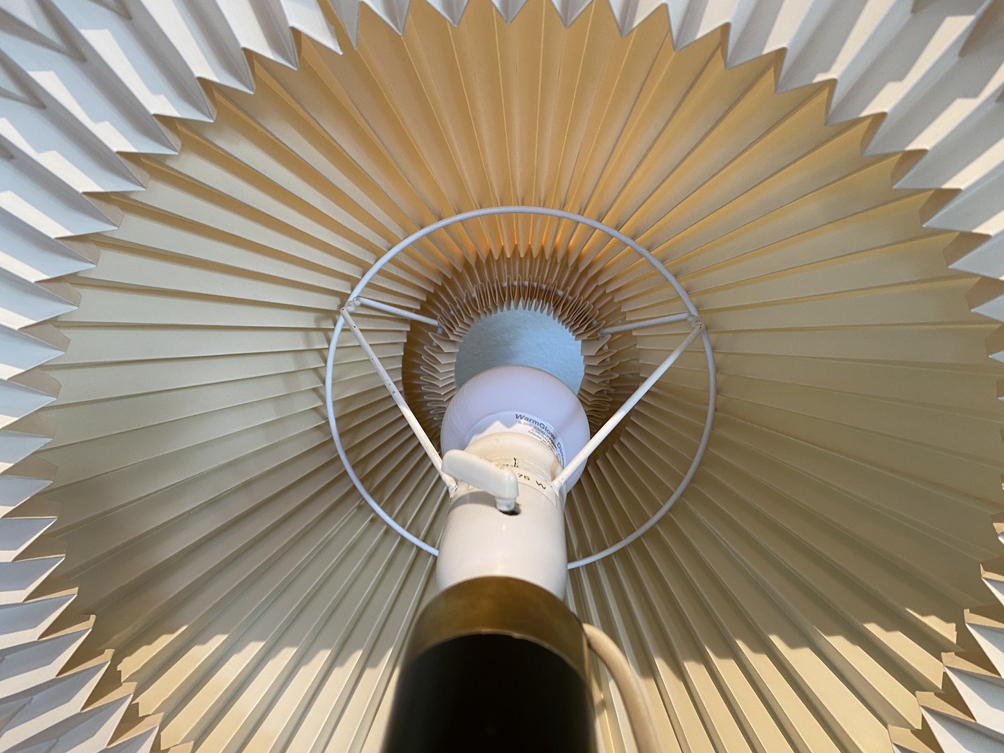 Varenummer: 622824Sjælden Le Klint bordlampe med lampefod af mørk grønt glas monteret med plisseret skærm.